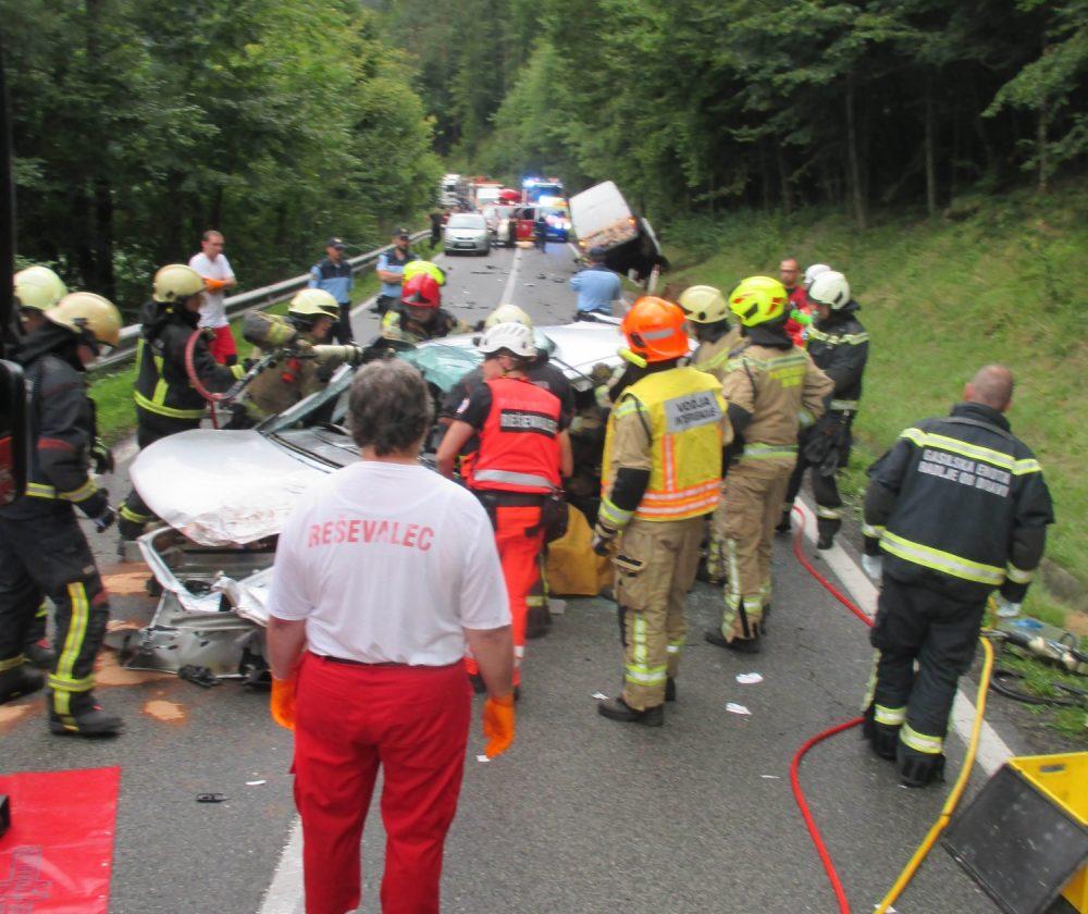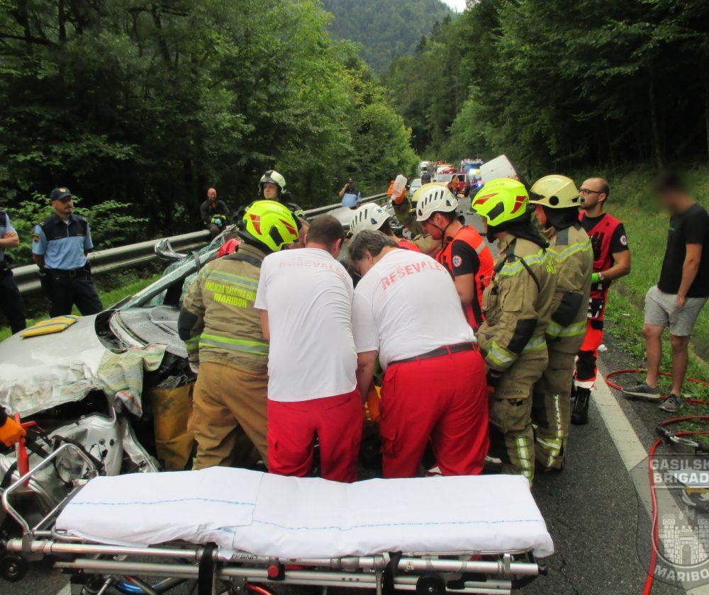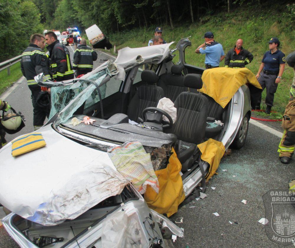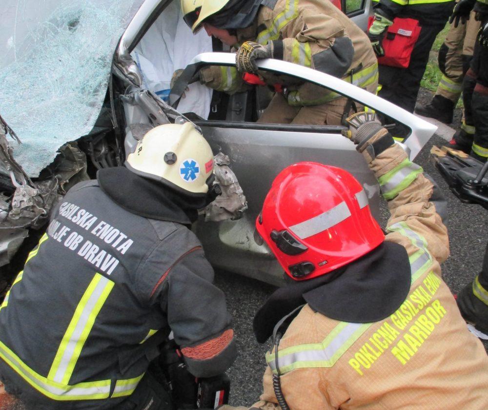 Ob 6.45 sta na cesti v kraju Vurmat trčili osebni vozili. Gasilci GB Maribor in PGD Radlje ob Dravi so s tehničnim posegom iz vozila rešili ukleščeno osebo, odklopili akumulatorje na vozilih, posuli iztekle motorne tekočine in pomagali reševalcem pri oskrbi poškodovancev.
