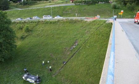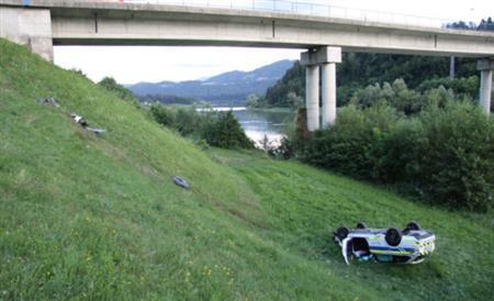 Patrulja je z namenom, da bi vozilo ustavila in preprečila nadaljnje ogrožanje, v križišču za Trbonje pričela prehitevati kombinirano vozilo. Koje bilo patruljno vozilo ob kombiju, je voznik slednjega sunkovito zavil v levo in namerno trčil v desni bok vozila policije, zaradi česar je vozilo policije odbilo v zaščitno ograjo mostu čez reko Dravo, jo poškodovalo, vozilo policije pa je zdrselo približno 30 m po strmem pobočju, kjer se je obrnilo na streho in ustavilo - le pet metrov pred strugo reke Drave. Na srečo se je tokrat končalo le s poškodbama policistov in vozila. Posledice bi lahko bile dosti hujše.