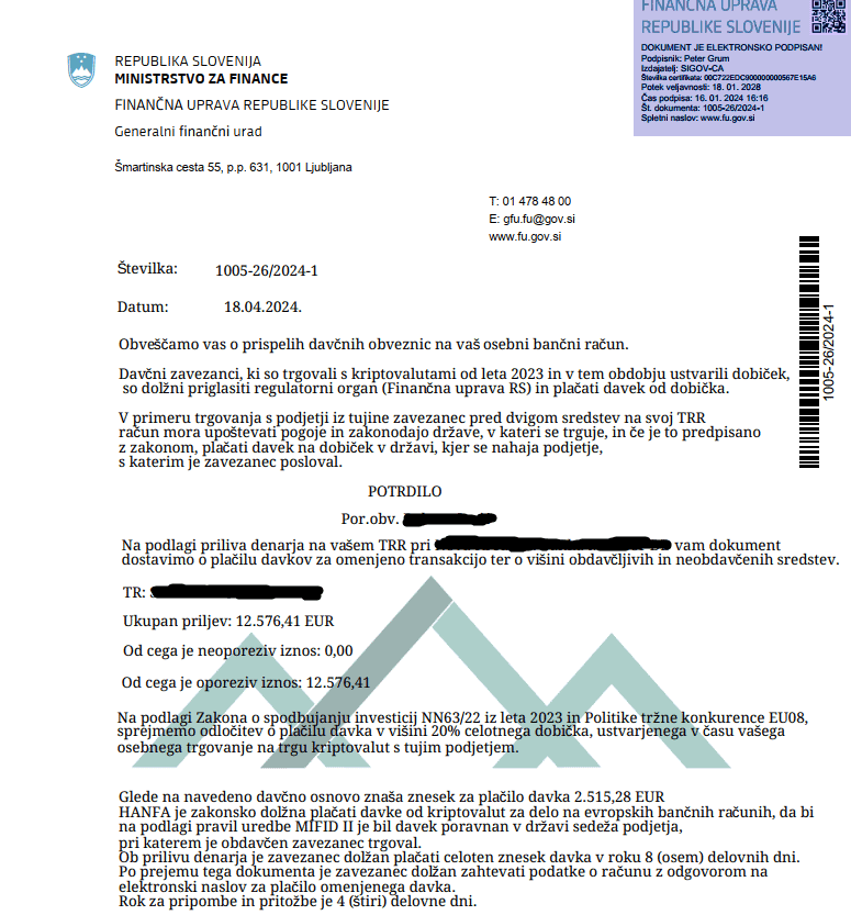 Spodnje prevarantsko sporočilo prepoznate po uporabi tujega jezika ter vodnem žigu logotipa, ki ga Finančna uprava v uradnih dopisih nikoli ne uporablja.