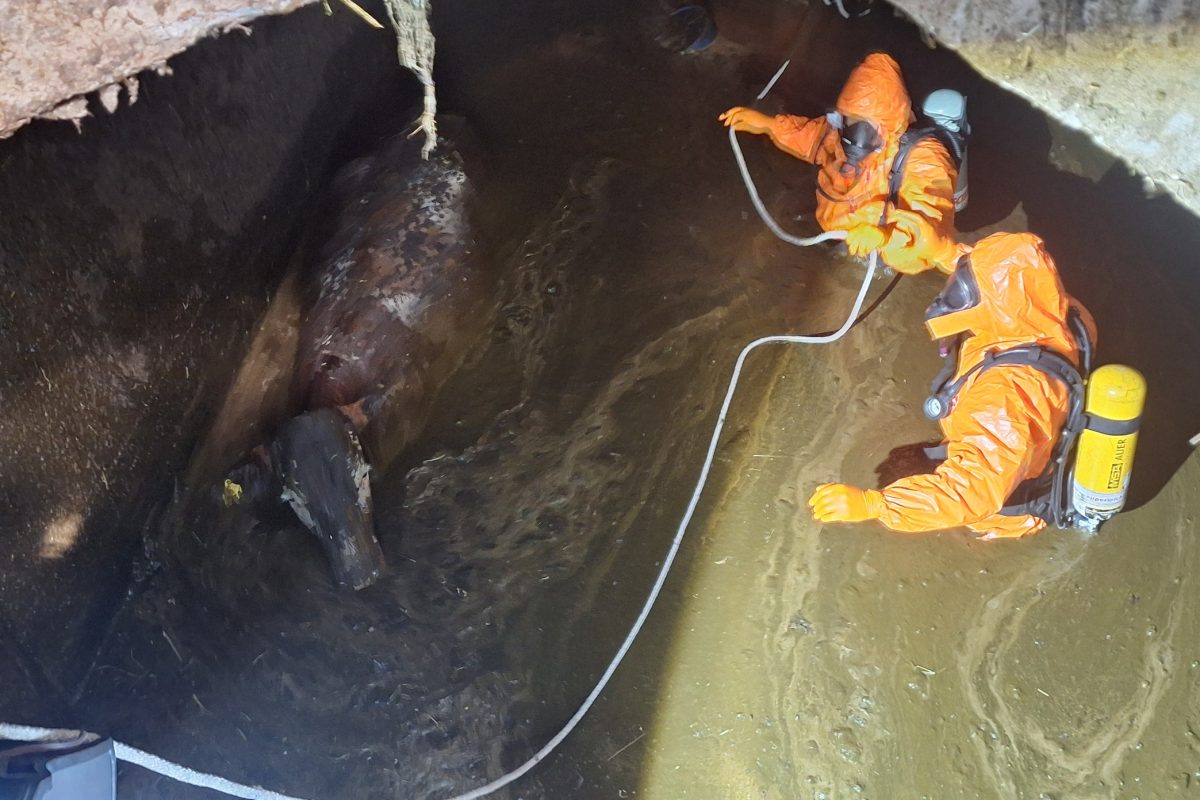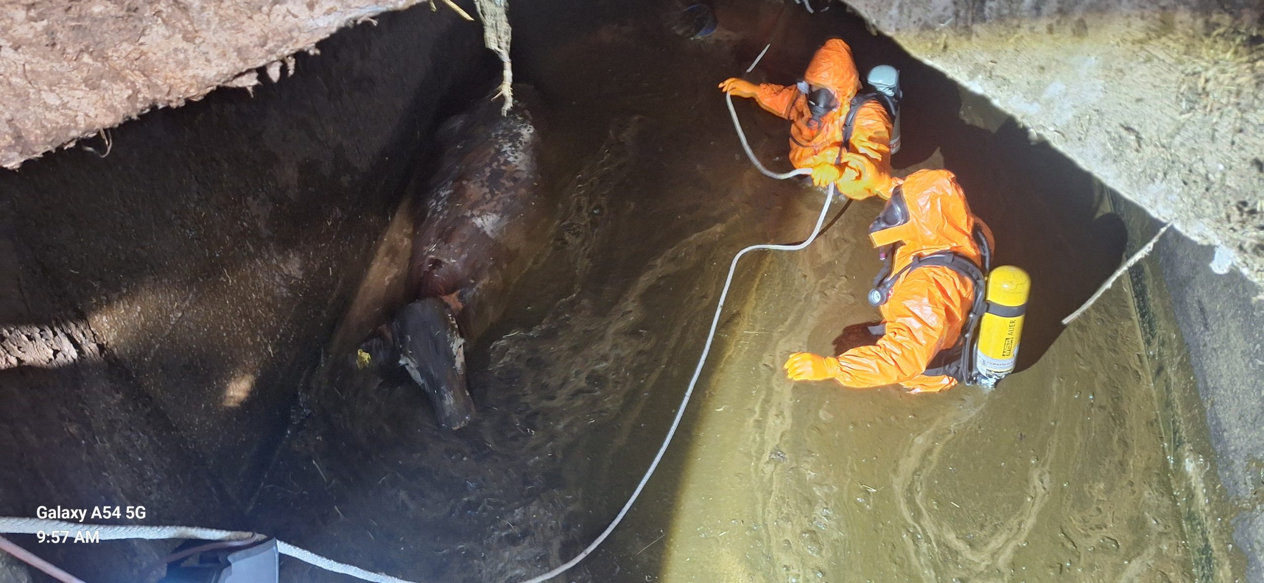 Danes ob 9.01 so bili gasilci PGD Stari trg iz Regijskega centra za obveščanje Slovenj Gradec obveščeni, da je v gnojno jamo padlo govedo.