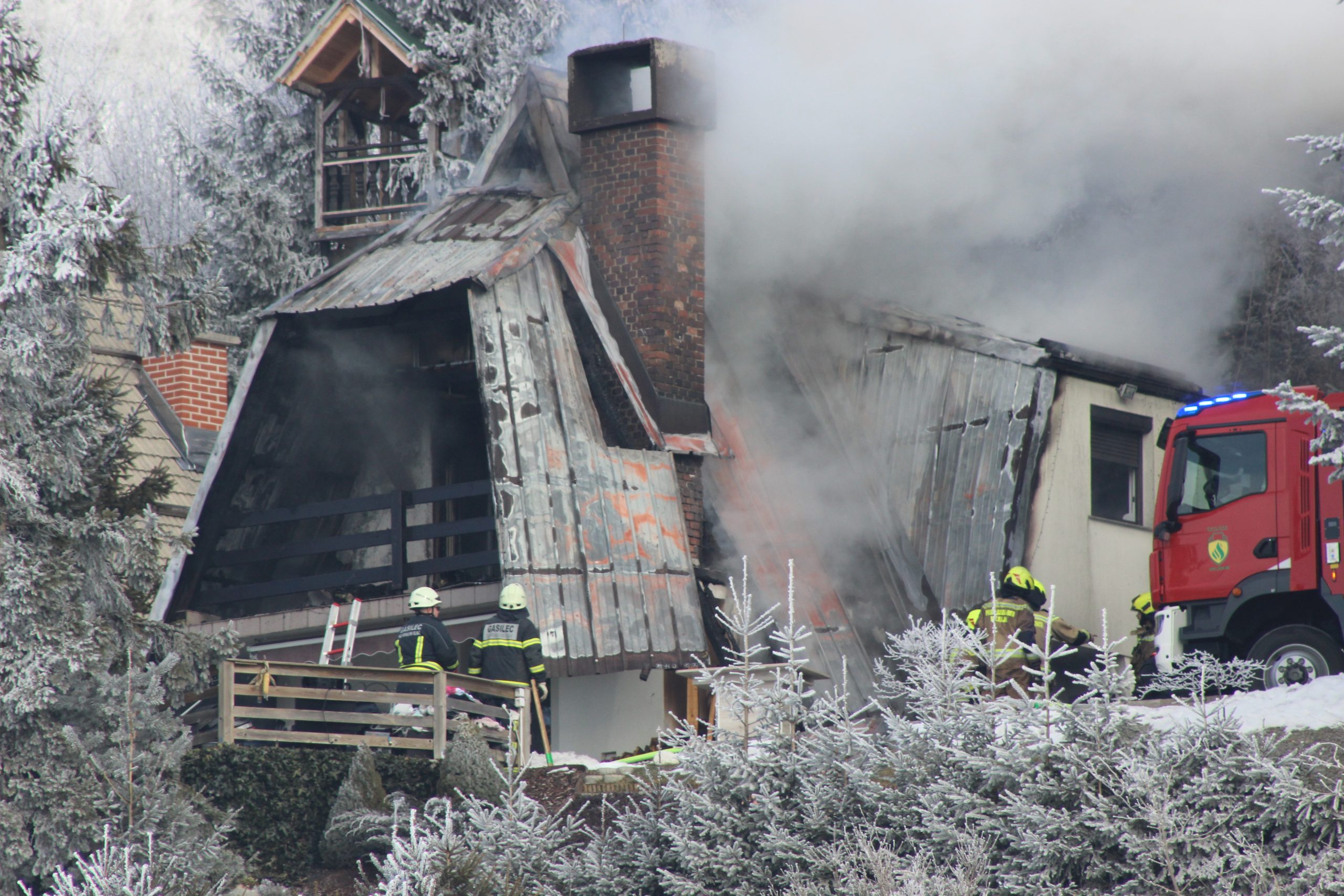 Ognjeni zublji so zajeli stanovanjsko hišo. "Po prvih podatkih je ogenj v celoti uničil mansardni in srednji del stanovanjske hiše. Materialna škoda bo visoka," poroča PU Celje.