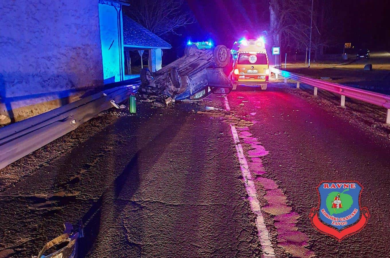 Ob 2.35 je v naselju Poljana, na cesti Ravne na Koroškem–Črna na Koroškem, voznik osebnega vozila zapeljal s cestišča, trčil v ograjo ter se z vozilom obrnil na streho.