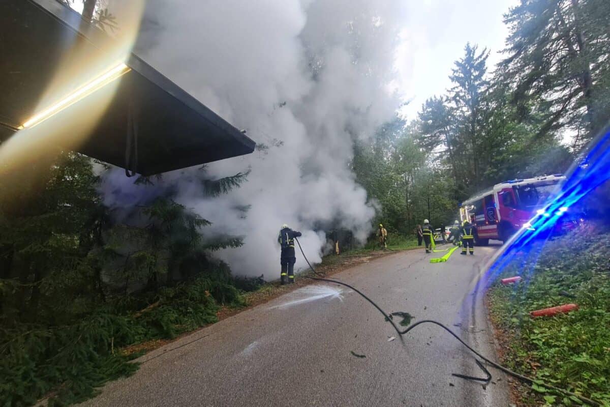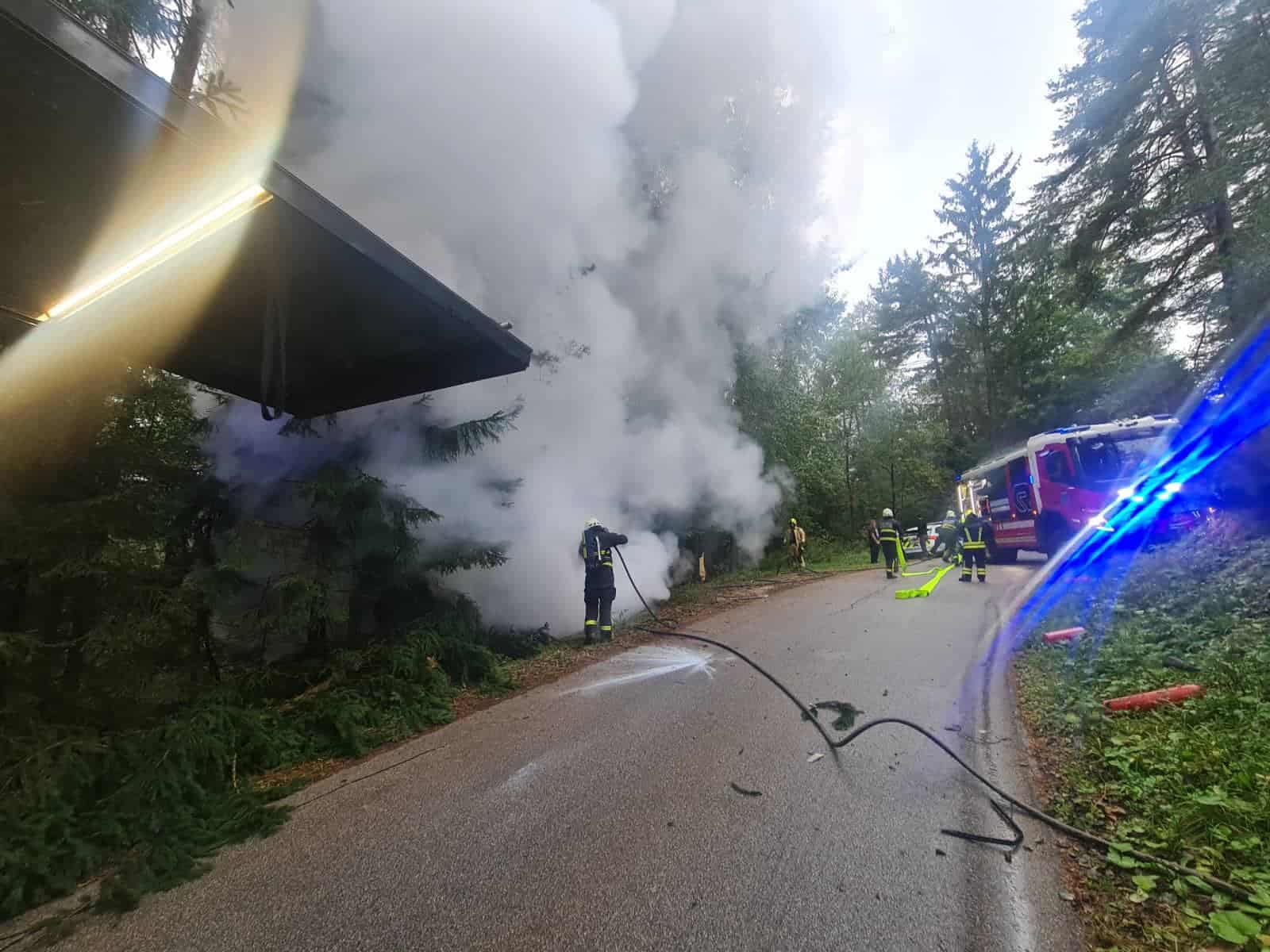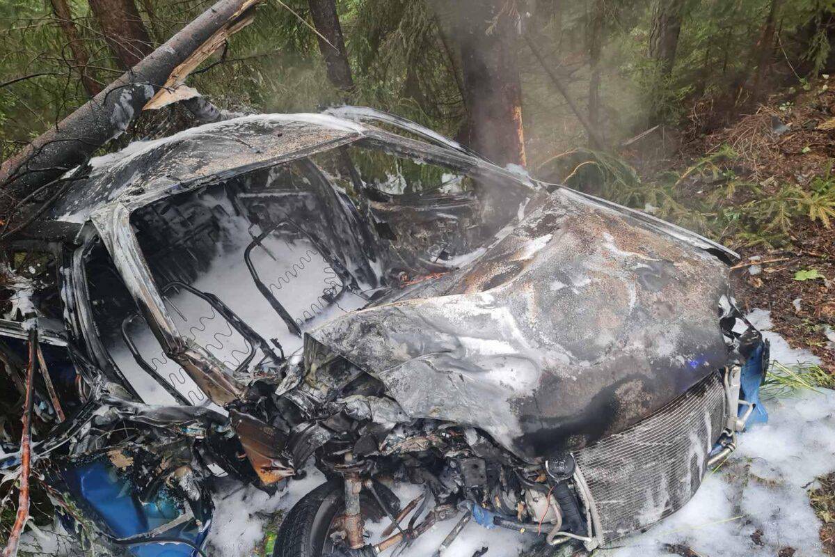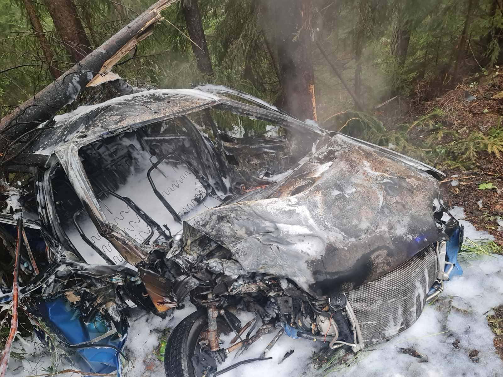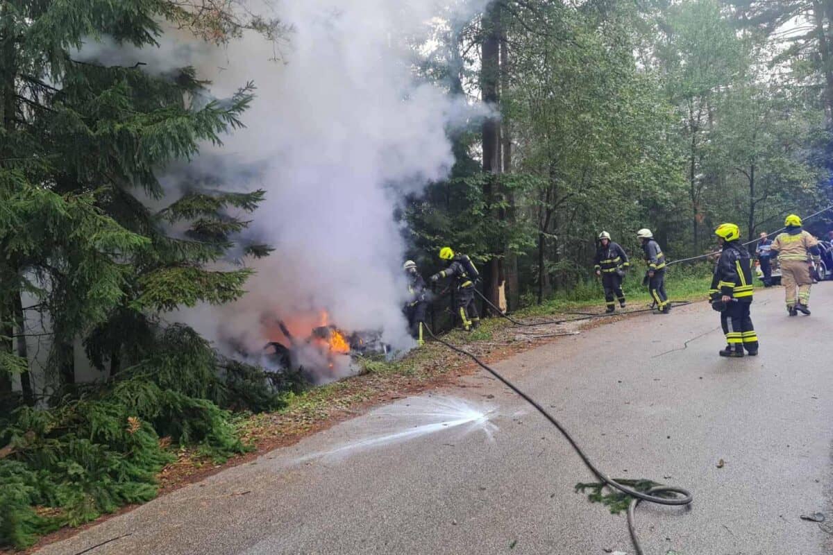 V naselju Breznica, na območju občine Prevalje, je ob 8.05 uri osebno vozilo trčilo v drevo in zagorelo.