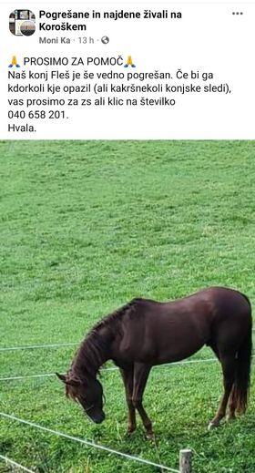 Konj je pobegnil s pašnika v Kotu nad Prevaljami. Sodeč po komentarjih na družbenem omrežju Facebook so dobili lastniki informacije, da je bil viden na Graški Gori.