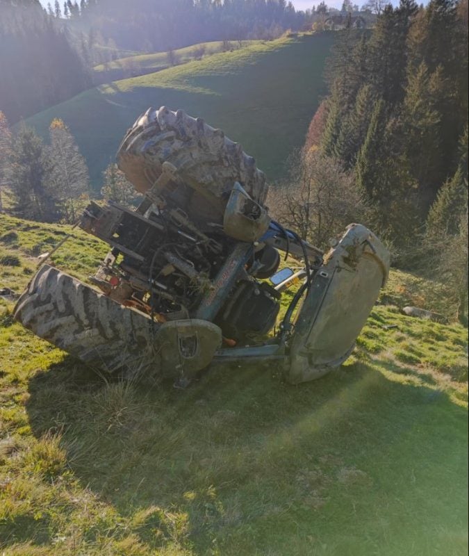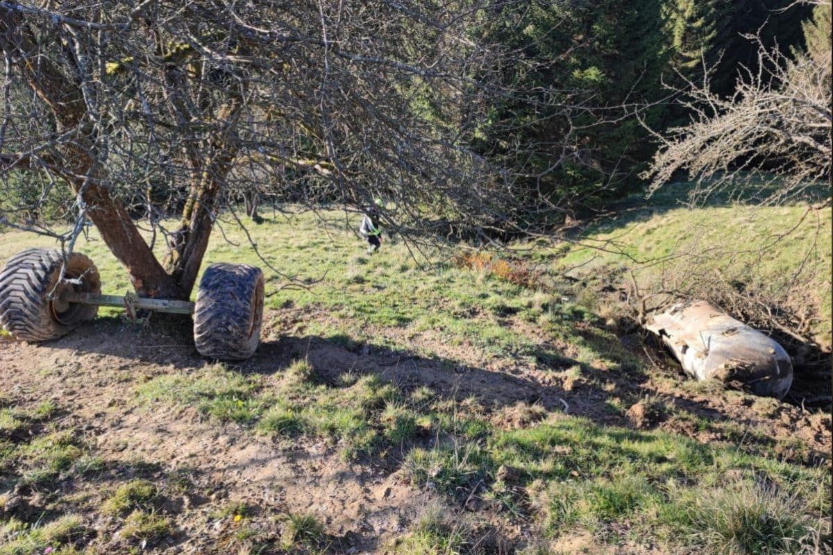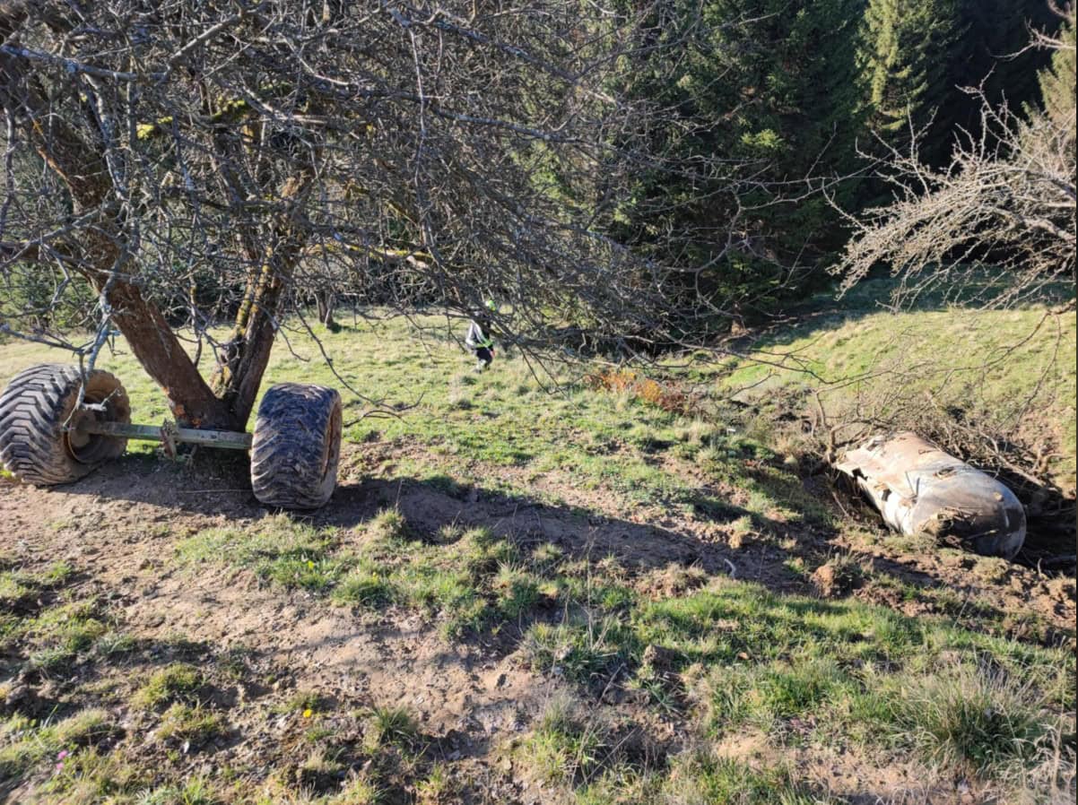 Traktor s cisterno gnojevke je ušel izpod nadzora ter obstal 100 metrov pod cesto na travniku, medtem ko je cisterna obstala še 50 metrov nižje. Voznik na srečo ni utrpel poškodb.