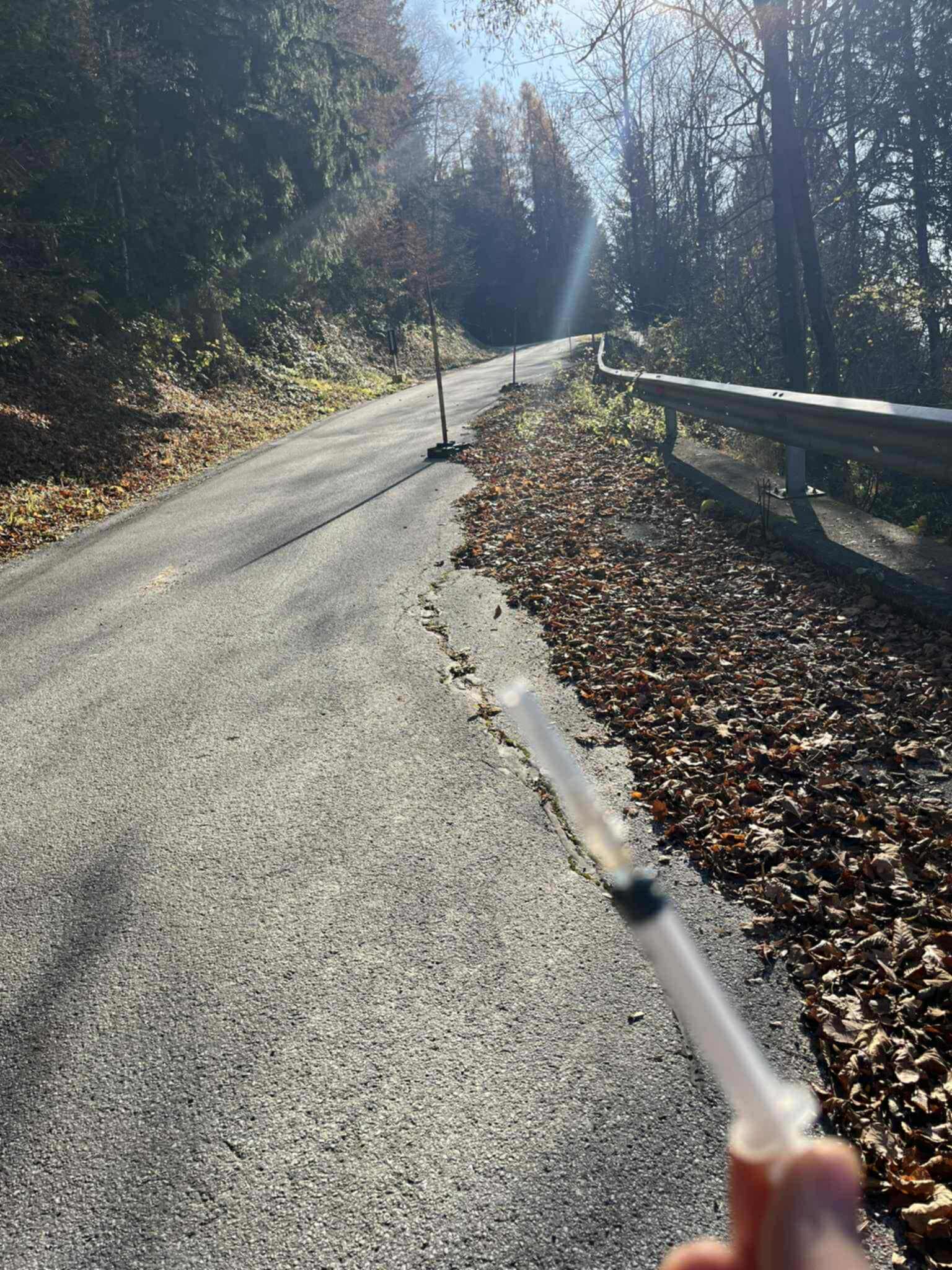 Sprehajalci so na poti proti vrhu, na delu ceste, kjer je delna zapora zaradi udora, našli iglo sredi listja ob cesti.
