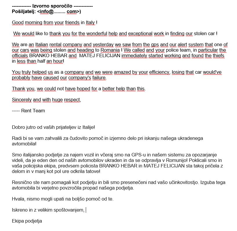 Policistoma so poslali pisno zahvalo za njun hiter odziv in učinkovito ukrepanje: