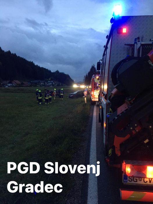 Ob 6.33 sta v Bukovski vasi osebni vozili trčili in nato zapeljali s ceste. Poklicni gasilci KGZ Ravne na Koroškem in PGD Slovenj Gradec so zavarovali kraj dogodka, odklopili akumulatorja ter nudili prvo pomoč eni osebi, ki bo zdravniško pomoč poiskala sama.