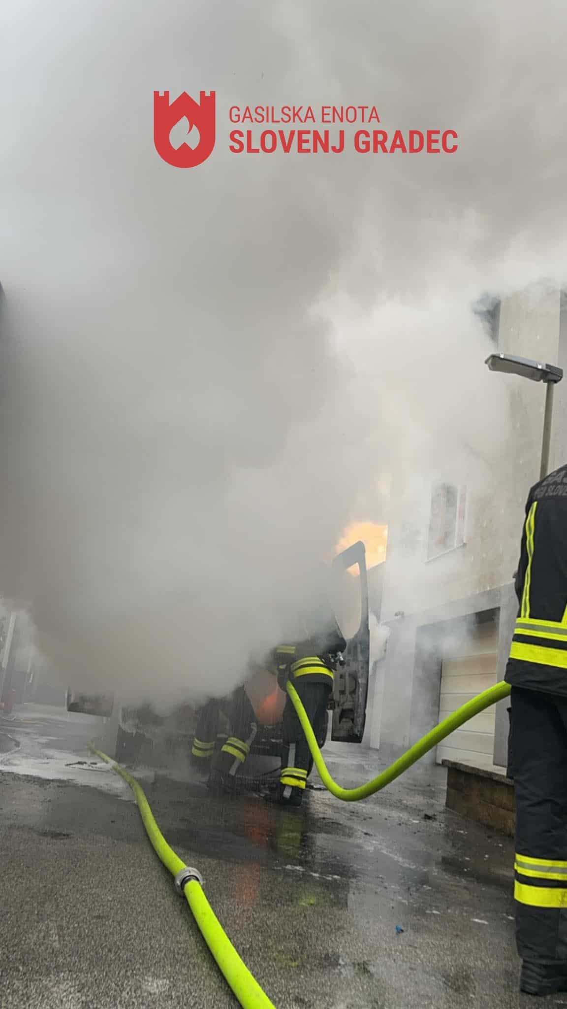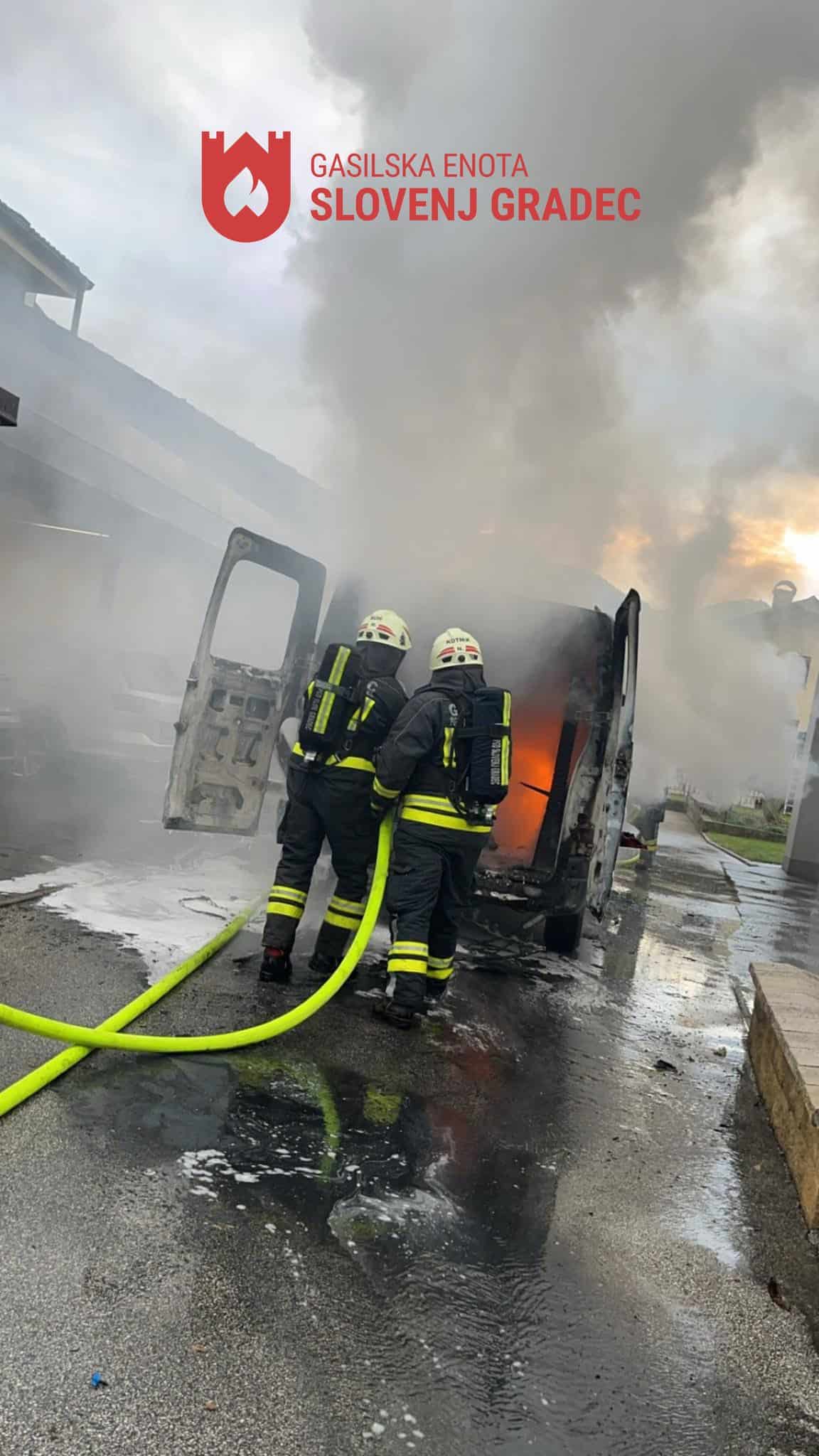Požar je vozilo popolnoma uničil. Ogenj je poškodoval tudi osebno in tovorno vozilo ter objekt v bližini.