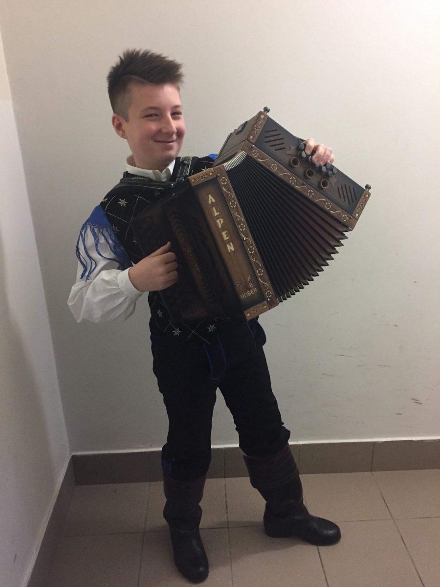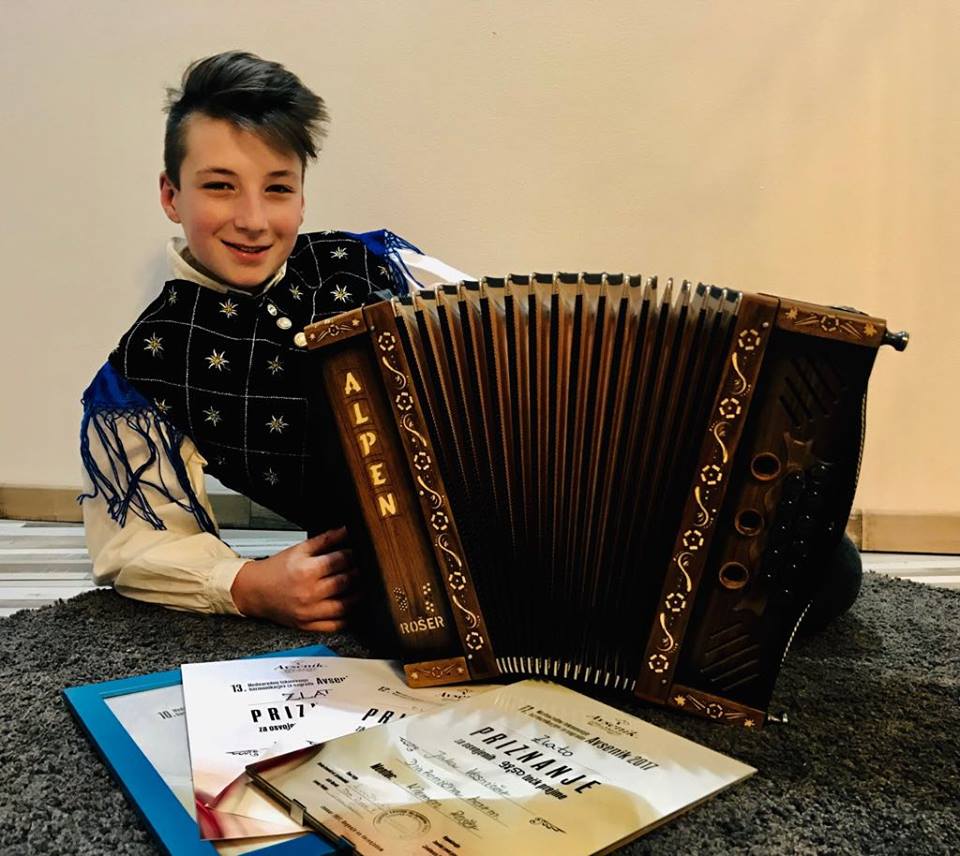 Tokrat vam predstavljamo še enega mladega glasbenika, ki z igranjem na harmoniko razveseljuje tako domače kot tudi sošolce in prijatelje, je prejemnik številnih priznanj, njegovemu igranju in petju pa ima možnost prisluhniti tudi kralj Matjaž, ki spi pod mogočno goro Peco.