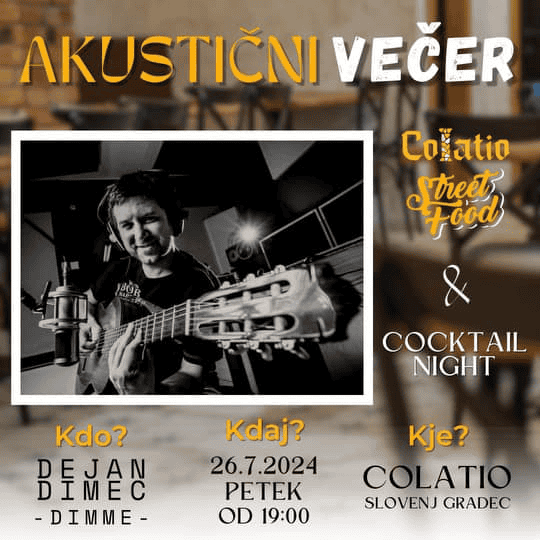 Od 20. ure dalje vas bo na terasi kavarne/slaščičarne Colatio Slovenj Gradec zabaval Dejan Dimec - Dimme, član priljubljene skupine Kingstoni in ustanovni član skupine Faušdur, znan koroški glasbenik.