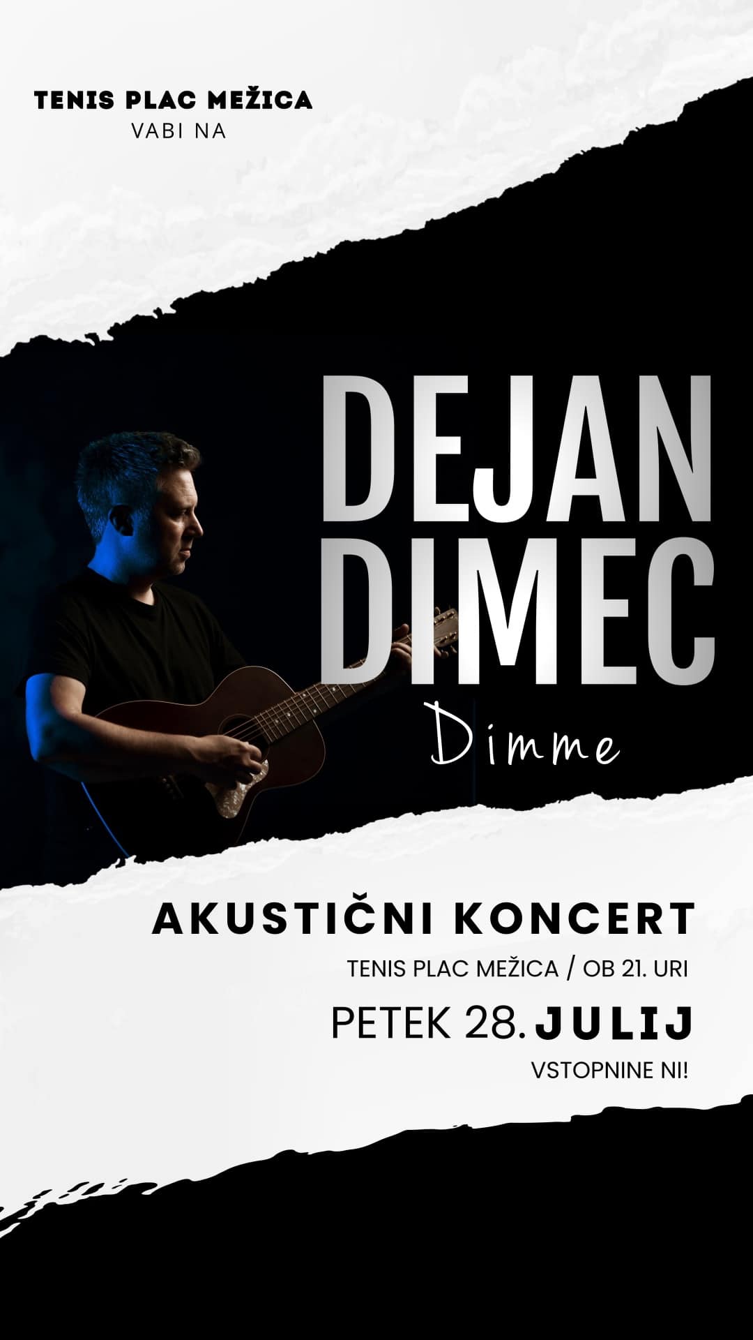 V petek, 28. julija 2023, ob 21. uri vabljeni na večer akustične glasbe v Mežico. Natančneje na "Tenis placo" Mežica (Malgajeva 3). Zabaval vas bo domačin Dejan Dimec.