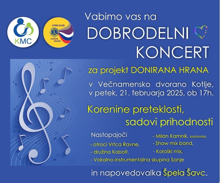 Na nepozaben petkov večer, 21. februarja 2025, bodo na oder Večnamenske dvorane Kotlje stopili številni glasbeniki, ki bodo združili moči na čudovitem dobrodelnem koncertu za projekt Donirana Hrana.
