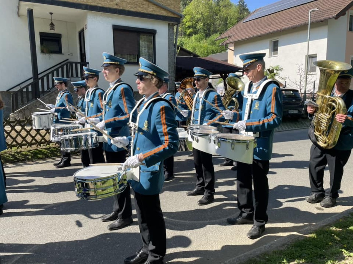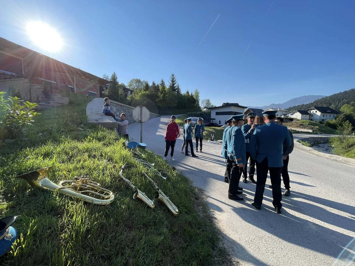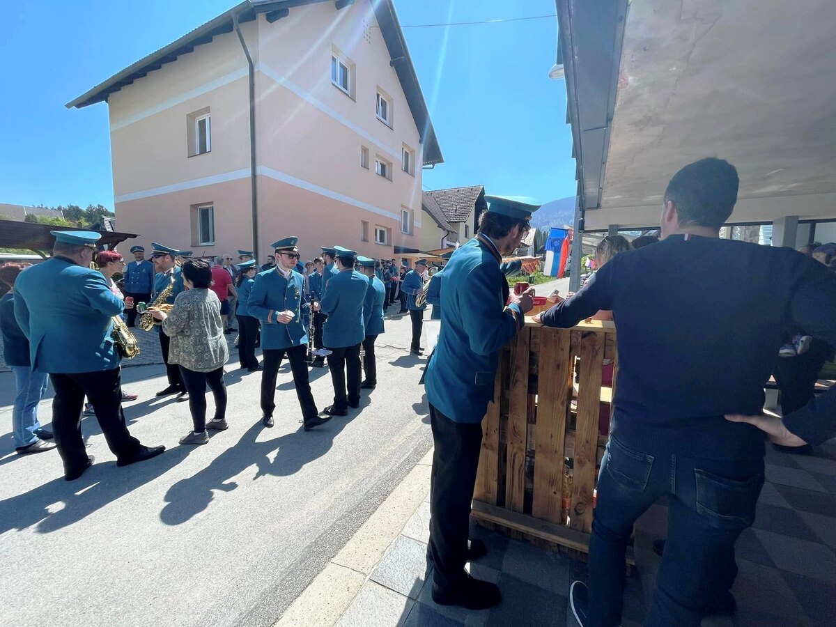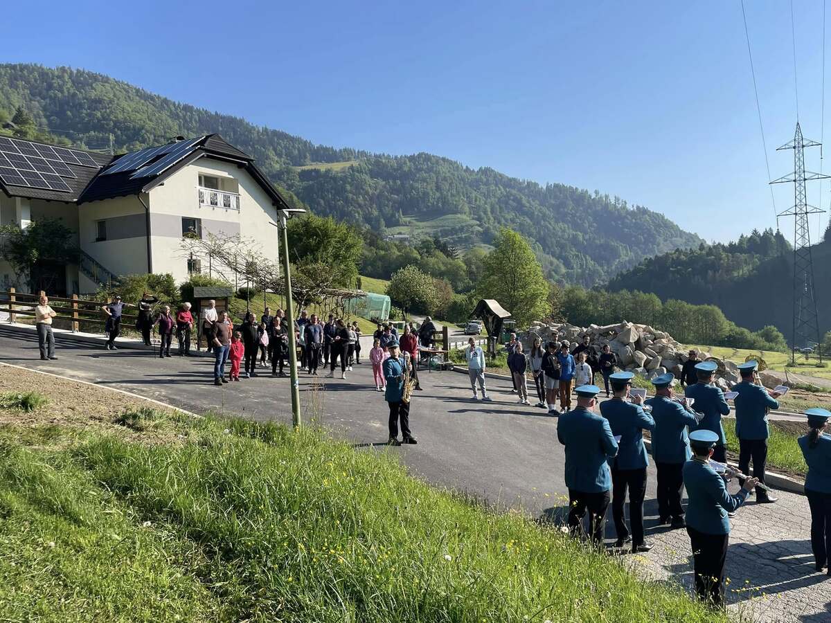 Že v zgodnjih jutranjih urah so krajanke in krajane prebudili živahni zvoki prvomajske budnice, ki jih je pričaral Pihalni orkester Železarjev Ravne.