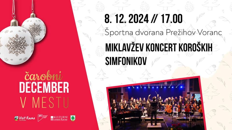 V nedeljo, 8. decembra 2024, nas bodo v okviru prazničnih dogodkov očarali Koroški simfoniki, ki za vas pripravljajo čaroben večer poln glasbe, petja in plesa.