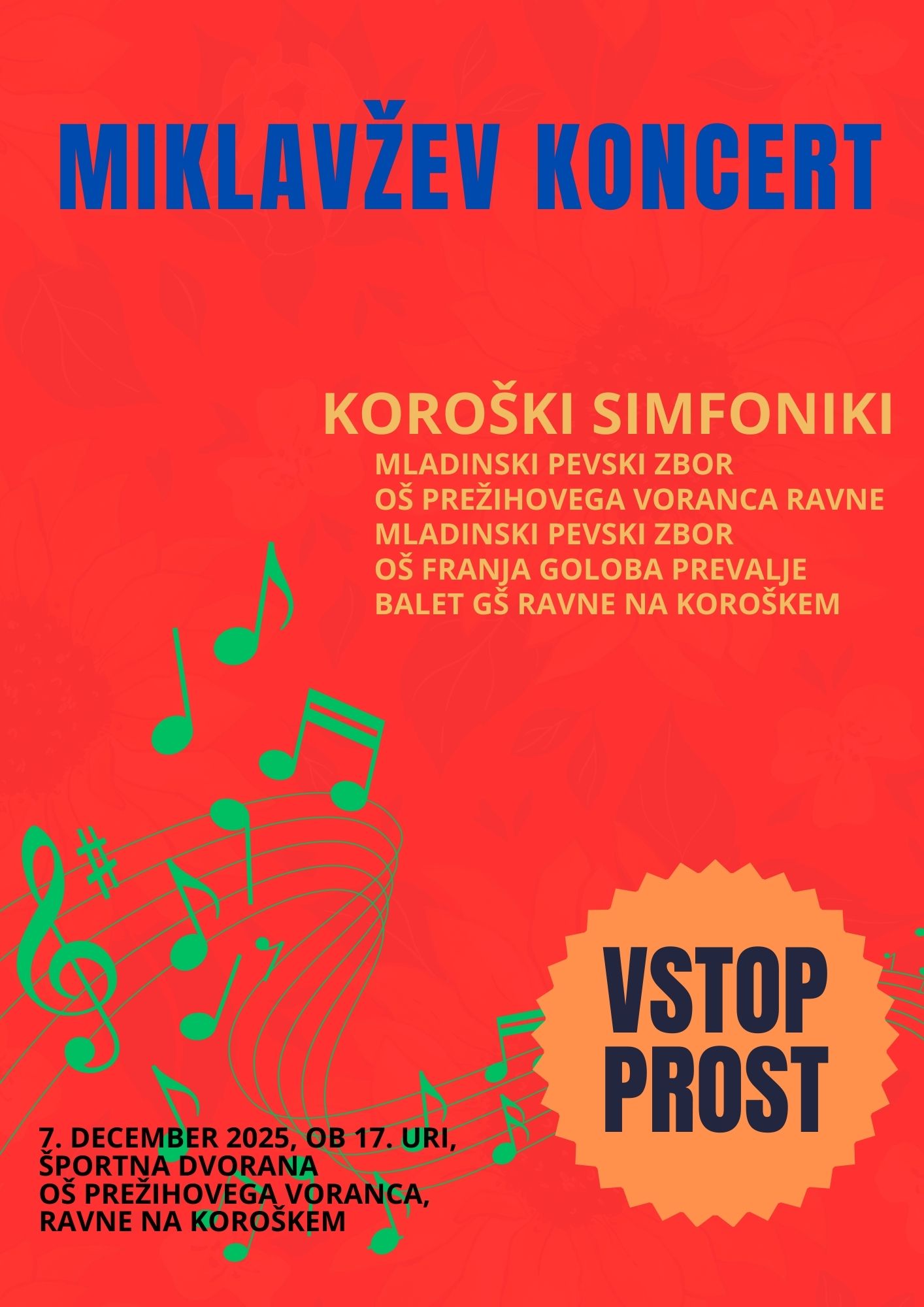 Tradicionalni Miklavžev koncert Koroških simfonikov, ki delujejo pod okriljem Društva Glasbenikov Europea, bo športno dvorano Osnovne šole Prežihovega Voranca znova napolnil z dobro voljo, dobro družbo in odlično glasbo. Da bo večer nekaj zares posebnega, se bodo orkestru izkušenih, vrhunskih glasbenikov pridružili tudi gostje.