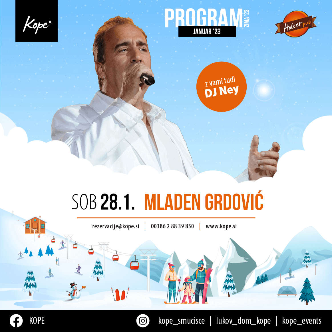 V soboto, 28. januarja, od 20. ure dalje prihaja v goste na Kope imenitni Mladen Grdović. 63-letni hrvaški pevec, ki že od leta 1996 poje pesmi o življenju, je nekaj let nazaj javno spregovoril tudi o svojih težavah z alkoholom. Izdal je veliko število albumov, ki so bili zelo uspešni. V svoji karieri je imel ogromno uspešnih koncertov tako doma kot tudi v tujini.