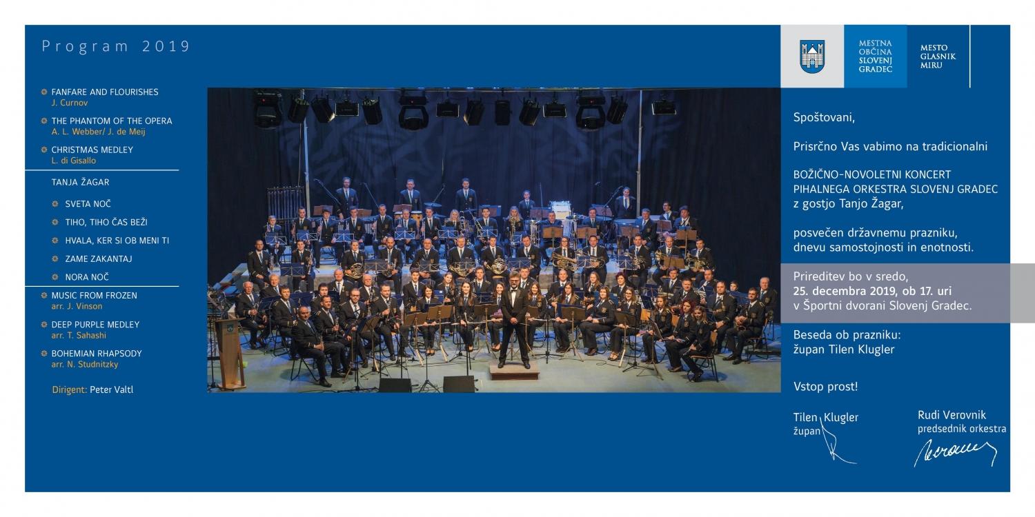 Mestna občina Slovenj Gradec in Pihalni orkester Slovenj Gradec z dirigentom Petrom Vaitlom ter gostjo Tanjo Žagar, na praznični dan vabijo k obisku tradicionalnega božično-novoletnega koncerta. Program, ki ga pripravljajo bo zanimiv in praznično obarvan. Med drugim bodo zaigrali Fanfare and Flourishes, The Phantom of the Opera, Bohemian Rhapsody... Tanja Žagar pa bo zapela Sveto noč, Tiho, tiho čas beži, Hvala, ker si ob meni, in druge.