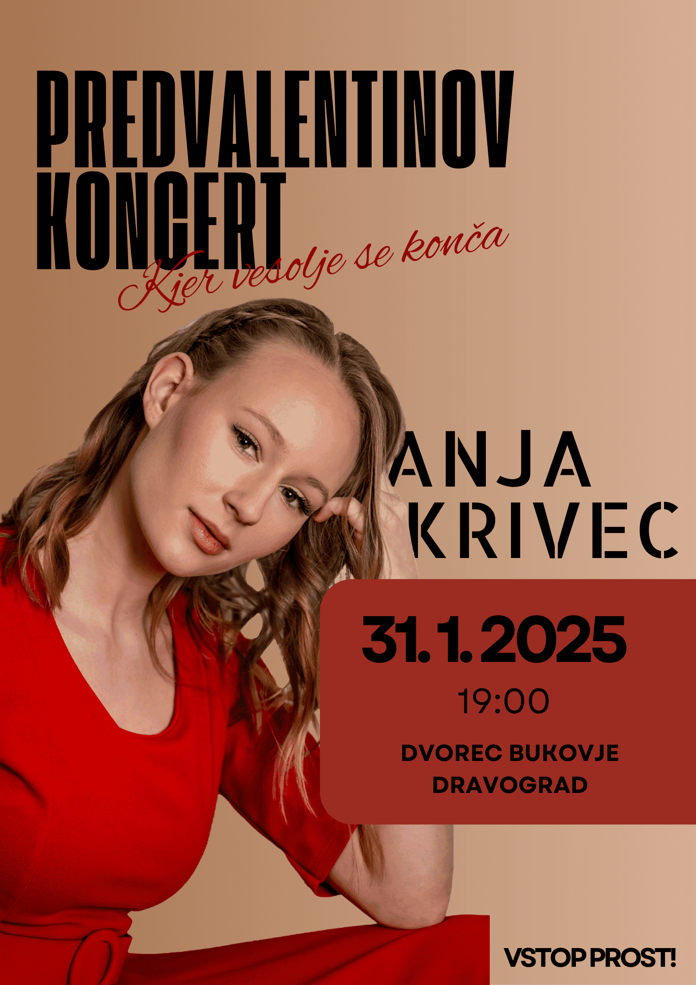 Konec meseca, 31. januarja 2025, ob 19.00 uri se bo v Dvorcu Bukovje v Dravogradu odvil čudovit koncert, ki ga v romantičnem vzdušju pripravlja mlada, odlična 22-letna Anja Krivec.