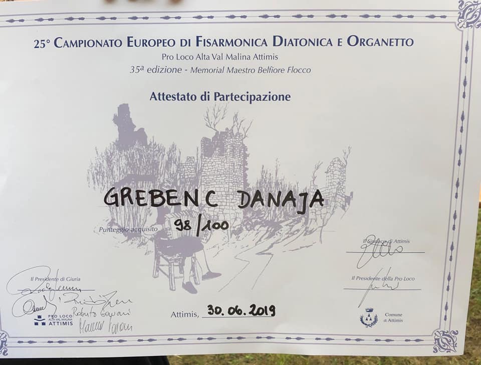 Na 25. Evropskem tekmovanju v igranju na diatonično harmoniko, ki je potekalo 30. 6. 2019, italijanskem Attimisu, so Korošice ponovno dokazale, da smo Korošci vedno za mušter bili. Absolutna evropska prvakinja 2019 je namreč postala Tina Kalajžič, njen uspeh pa sta dopolnili še Danaja Grebenc in Kaja Završnik.