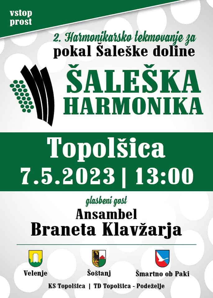 Harmonikarsko tekmovanje - Šaleška harmonika za pokal Šaleške doline 2023 bo že drugo leto zapored potekalo prihajajočo nedeljo, 7. maja 2023, ob 12. uri v Topolšici - pod velikim šotorom poleg novega gasilskega doma.