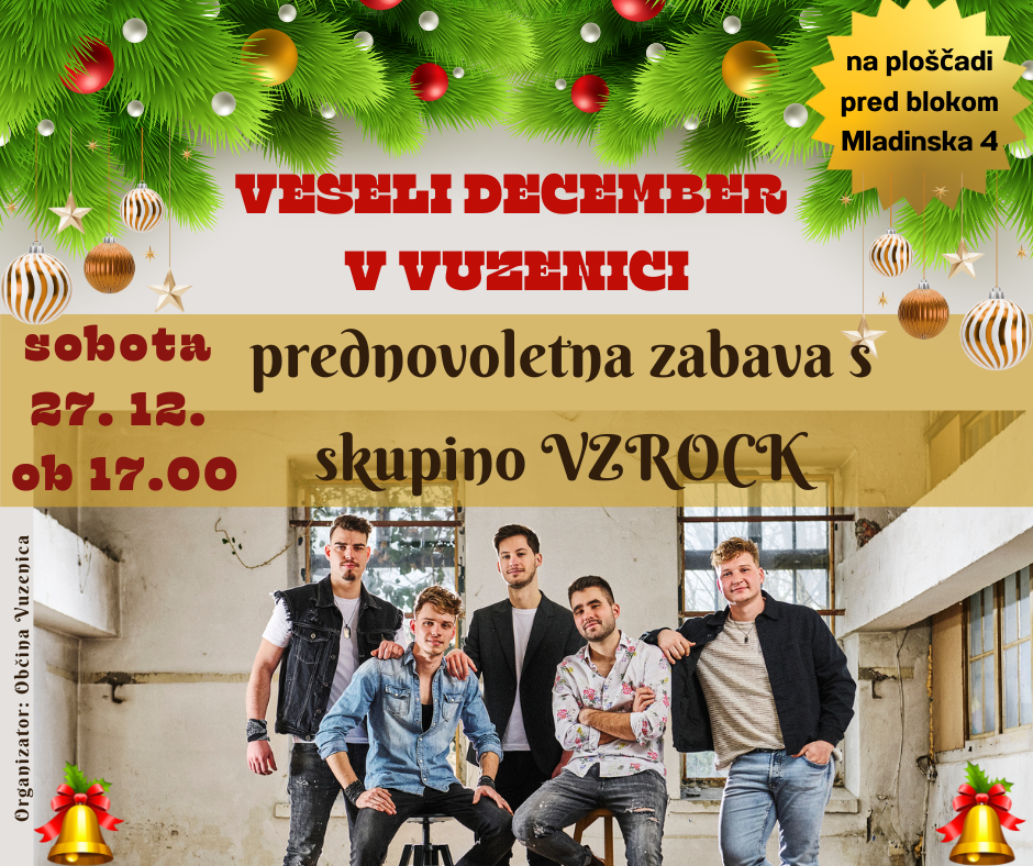 Z zabavo pred novim letom s skupino Vzrock boste uživali na ploščadi pred Pizzerijo Monini (Mladinska ulica 4), v soboto, 27. decembra 2025, ob 17. uri.