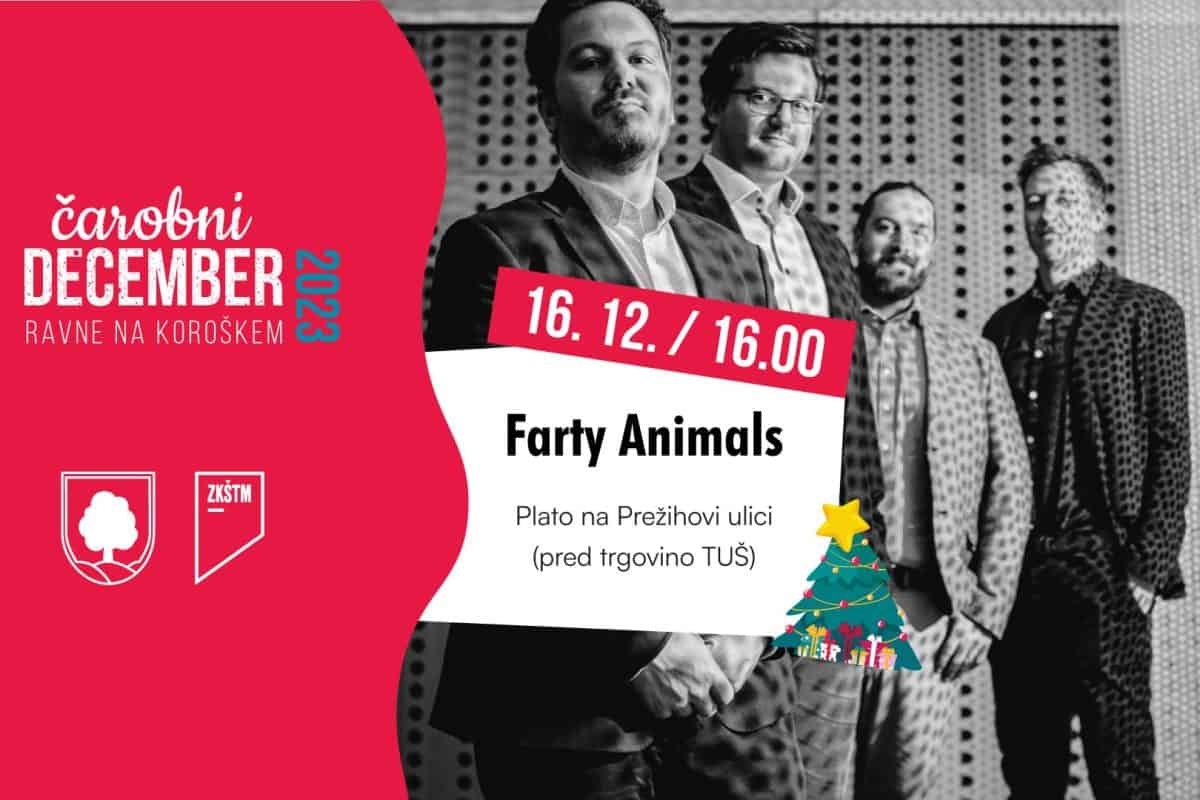 V soboto, 16. decembra 2023, vas vabijo, da se jim od 16. ure naprej pridružite na mestnem platoju na Ravnah, kjer bodo za čaroben in nepozaben večer poskrbeli kleni Korošci, fantje zasedbe Farty Animals.