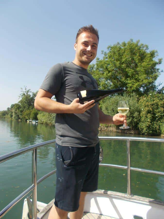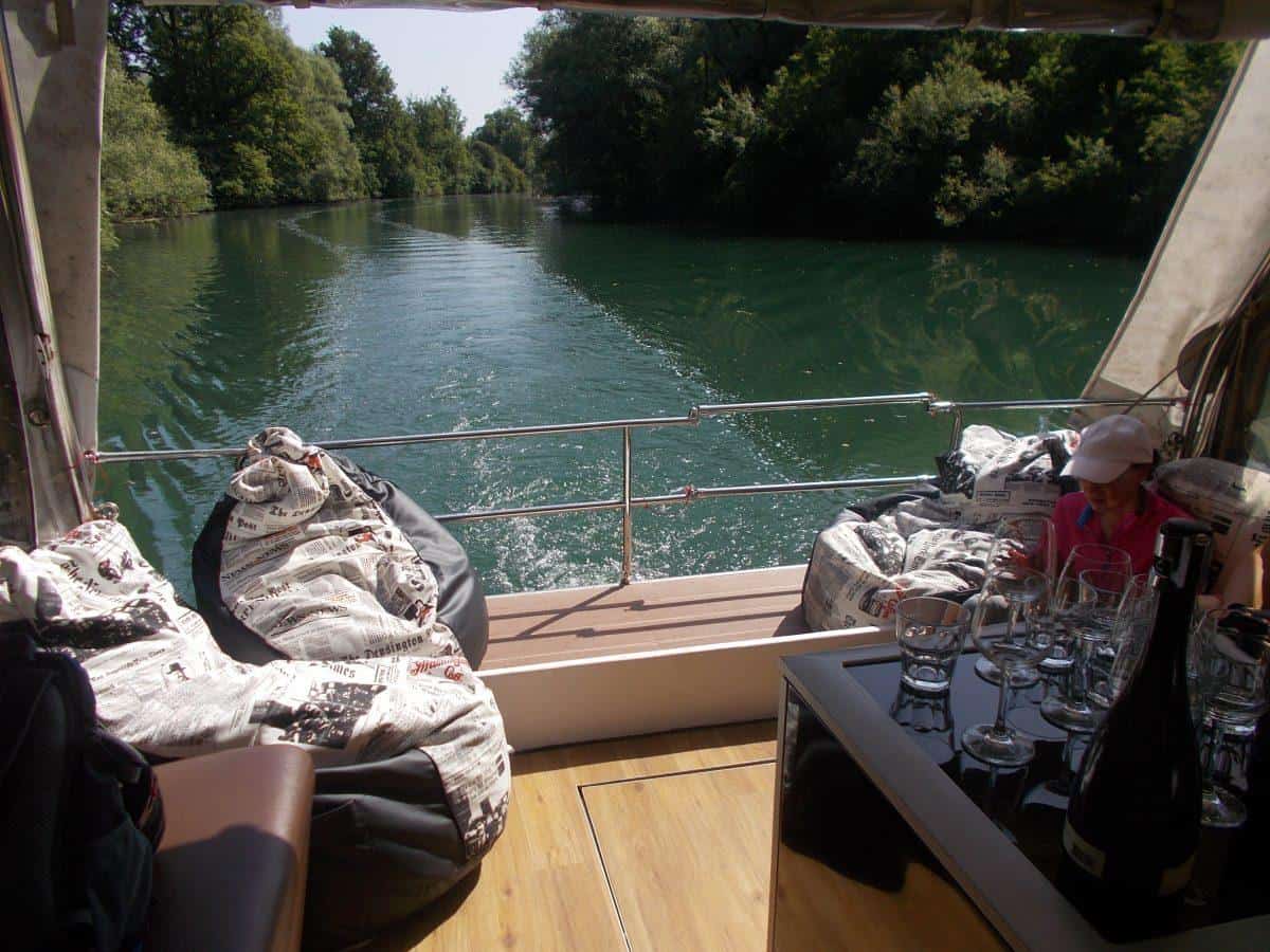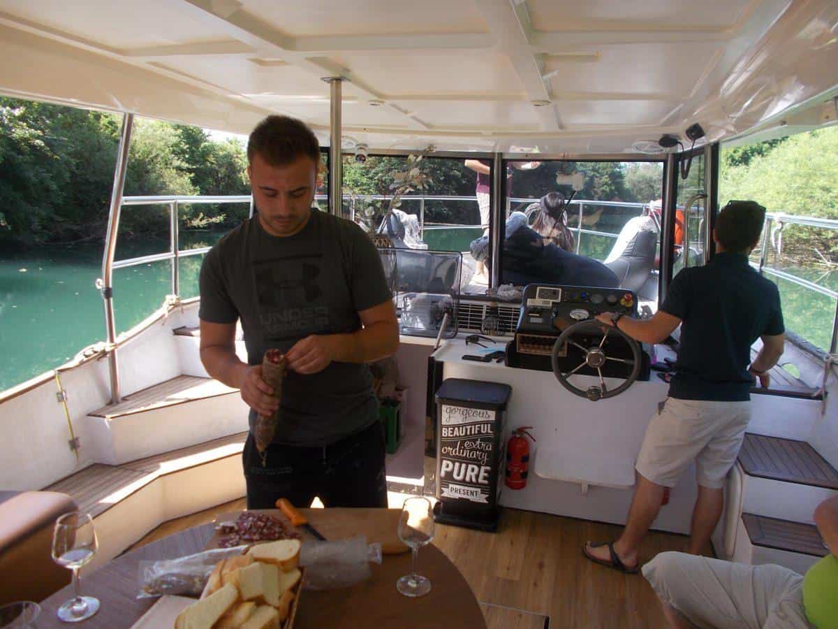Vse naokoli tišina. Zelena je reka. Zeleno je grmovje, ki jo robi. Zeleni so skupki dreves, ki jo senčijo in ponujajo zatočišče veselo pojočim ptičem. V zraku so insekti in med njimi nastopaški kačji pastirji in romantično razpoloženi metulji. Črički godejo v barjanskih travnikih, ki segajo do vode. Polja stoje mirno in vdano vpijajo kričeče sončne žarke. Tu in tam zasledimo nutrijo, opazimo pižmovko in vidro, ko se obešenjaško potapljajo v valove. Mlado jutro postaja dan! Slišim svoj utrip srca. In potem slišim pok zamaška od penine. Matija in Juš jo postrežeta nam, ki smo na palubi, v udobnih stolih in tistim, ki so v kabini. Potem zadiši po kruhu, spečenem v krušni peči, ki mu delata družbo ravno prav posušena salama in kulen. Vse prinešeno iz kmetije Kuren. Vino, ki sledi je hladno in dobro. Minute se iztekajo, doživetje ostaja. Idealno za turistične skupine, poslovne dogodke, slavja, team buildinge... Cena 150 EUR na uro. Hrana in pijača po dogovoru.