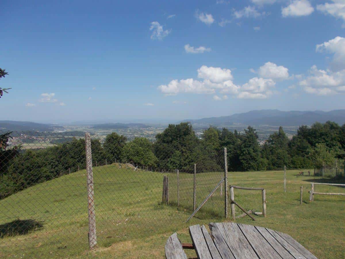 Na hribu z razgledom na barje in Ljubljano in še naprej, se v zeleno barvo travnikov, gozdov sadovnjaka in drevja, ki se stegujejo proti cerkvici ter jo mistično zapreda v svoje listje, stoji velika hiša. Pred dvema desetletjema je zrastla na temeljih stare. Ko vstopiš te objame les, ki se zrcali v pohištvu, starinah in številnih slikah po stenah, in je poleg opečnatih tal gradbeni materijal, ki poleg krušne peči na sredini hodnika (tako, da moraš obvezno mimo nje in moraš z vsemi svojimi čuti srkati nektar hrane, ki se v njej pripravlja) nadeva kmetiji prvobitni občutek pra-domačnosti.