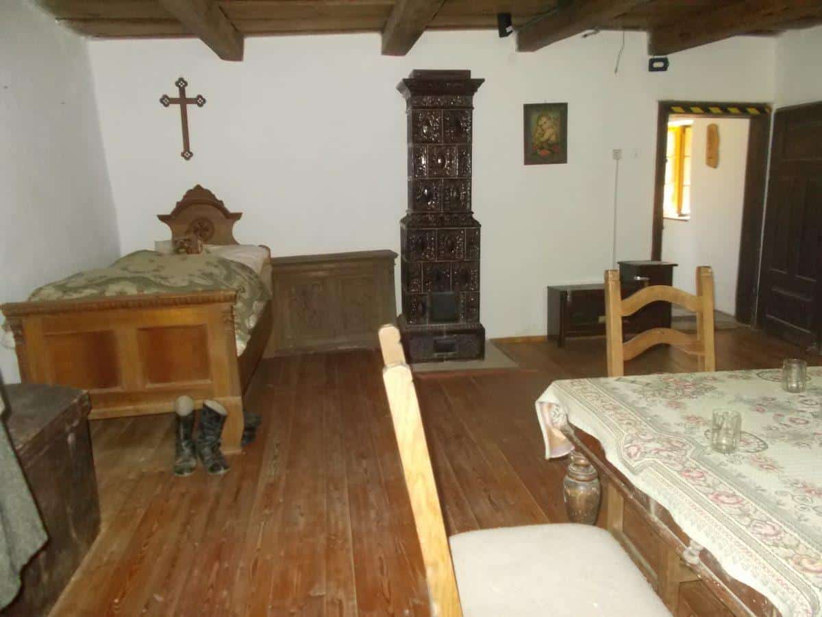 Notranjost Hiše pobega, v postelji počiva okostnjak