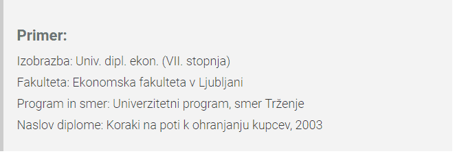 Kot delovne izkušnje navajamo tudi izobrazbo v obrnjenem kronološkem zaporedju. Dovolj je že, da navedete najvišjo doseženo stopnjo. Osnovne šole ne navajamo.