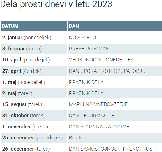 Za vas smo pripravili koledar praznikov oziroma dela prostih dni v Sloveniji. Preverite, kdaj si je v letu 2023 najbolje načrtovati dopust ali podaljšan vikend oddih.