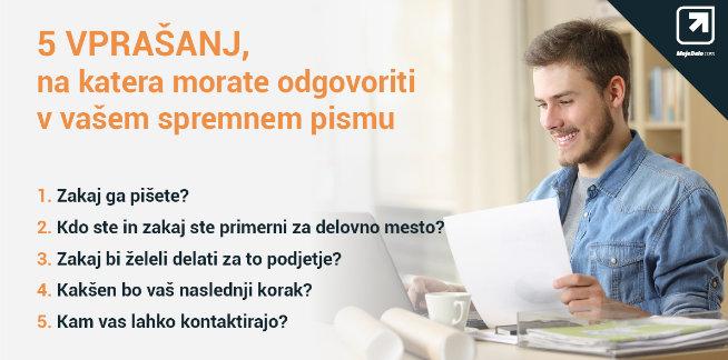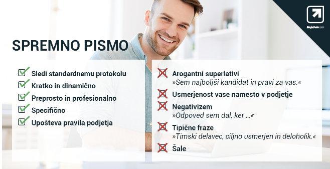- Pokažite navdušenje nad razpisanim delovnim mestom. Vaše spremno pismo naj ne izžareva sporočila »dajte mi delo, kjer lahko napredujem in več zaslužim«, ampak »navdušen sem nad možnostjo, da lahko s svojim znanjem in izkušnjami pomagam podjetju pri doseganju njegovih rezultatov«.