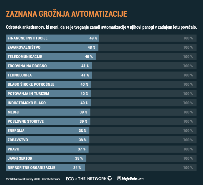 Poleg ekonomskih skrbi, ki jih je povzročila pandemija, zaposleni na globalni ravni vidijo tudi avtomatizacijo kot grožnjo za njihovo delovno mesto. Kar 41 % sodelujočih v raziskavi je postalo v tem času še bolj zaskrbljenih glede avtomatizacije, pri nas je ta delež precej nižji od globalnega povprečja in znaša 29 %. Glede avtomatizacije so na globalni ravni še posebej zaskrbljeni zaposleni v finančnih institucijah (49 %), zavarovalništvu (48 %) in v telekomunikacijskih podjetjih (45 %). Najmanj zaskrbljeni, da bi tehnologija nadomestila njihovo delo, pa so zaposleni v neprofitnih organizacijah (34 %), javnem sektorju (35 %) in pravu (37 %).