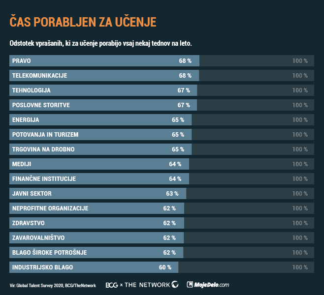 65 % vseh sodelujočih v raziskavi se izobražuje v okviru službe, 62 % se jih samoizobražuje, 48 % jih obiskuje spletne izobraževalne tečaje, 41 % po novo znanje hodi na konference in seminarje, 36 % pa jih uporablja mobilne aplikacije. Zaposleni v pravu, telekomunikacijah, tehnologiji in poslovnih storitvah v povprečju največ časa namenijo dodatnemu izobraževanju.