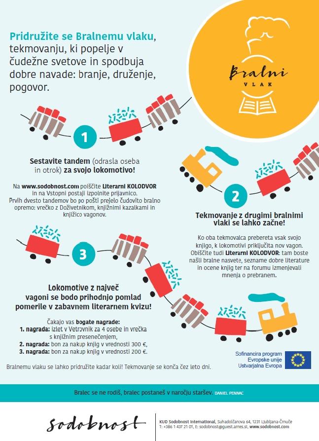 Bralni vlak je zabavno tekmovanje, ki k sodelovanju vabi bralni tandem, otroka in odraslo osebo (starša, skrbnika, babico, dedka, strica ali teto), kjer z branjem knjig nabirata vagone in s tem tekmujeta z drugimi lokomotivami, torej z drugimi tekmovalnimi pari. Za udeležbo sta potrebna dva, ki iščeta motivacijo ali pa bi svoje navdušenje rada delila ter se z domišljijo odpeljala na različne konce sveta, resničnega ali izmišljenega.