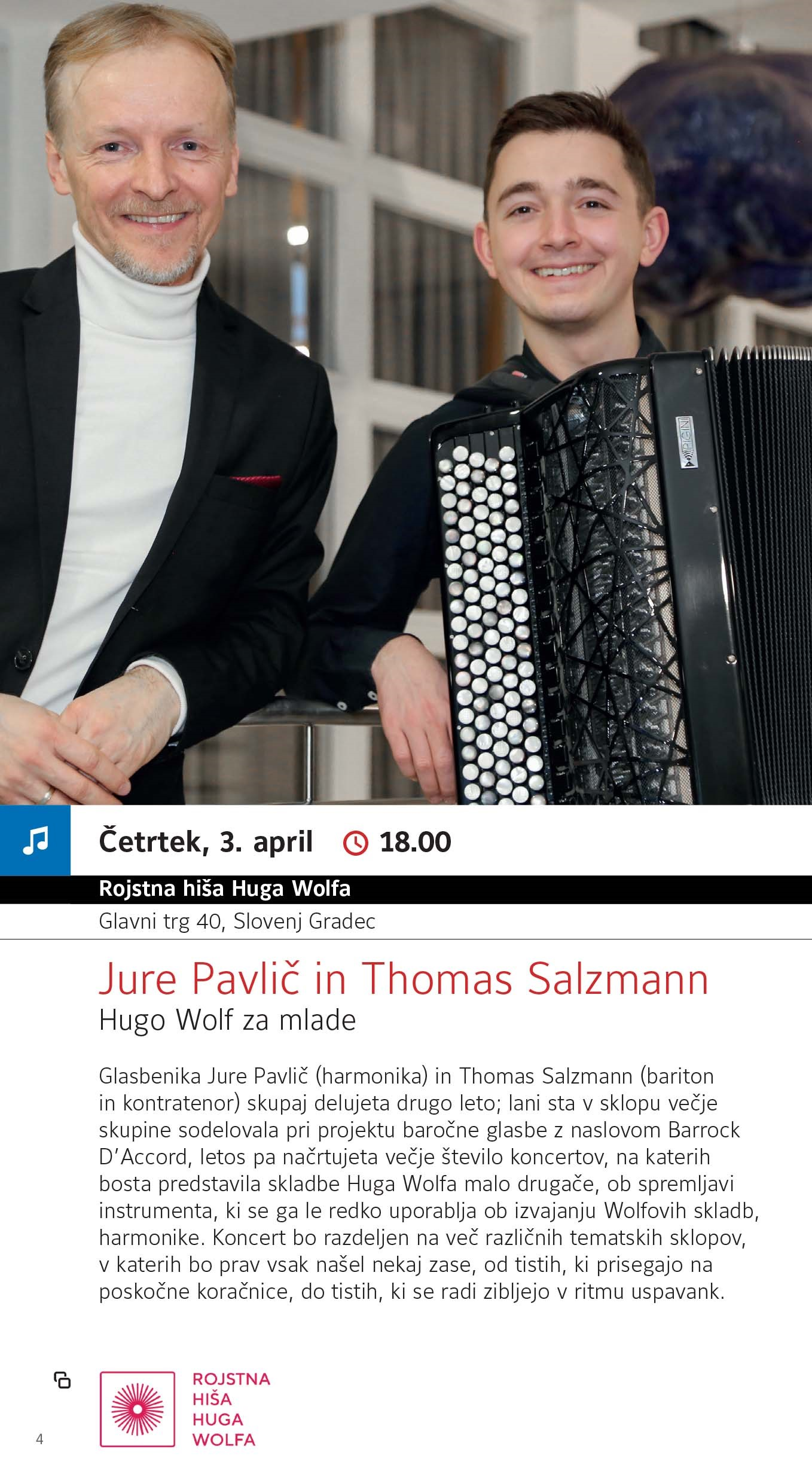 Na odru bosta nastopila harmonikar Jure Pavlič in pevec Thomas Salzmann (bariton in kontratenor), ki bosta Wolfove skladbe predstavila v sveži in inovativni preobleki. Harmonika, instrument, ki se le redko uporablja pri interpretaciji skladb tega skladatelja, bo tokrat v ospredju in bo skupaj z vokalom pričarala edinstveno glasbeno izkušnjo.