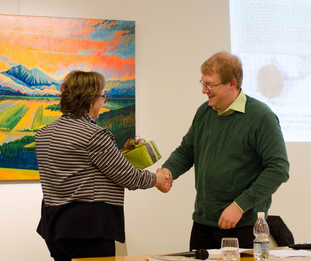 Bibliotekarki Simona Šuler Pandev in Simona Vončina sta prebrali zapis urednice dr. Katarine Keber in obeh recenzentov doc. dr. Toneta Ravnikarja in zaslužnega prof. ddr. Janeza Höflerja.