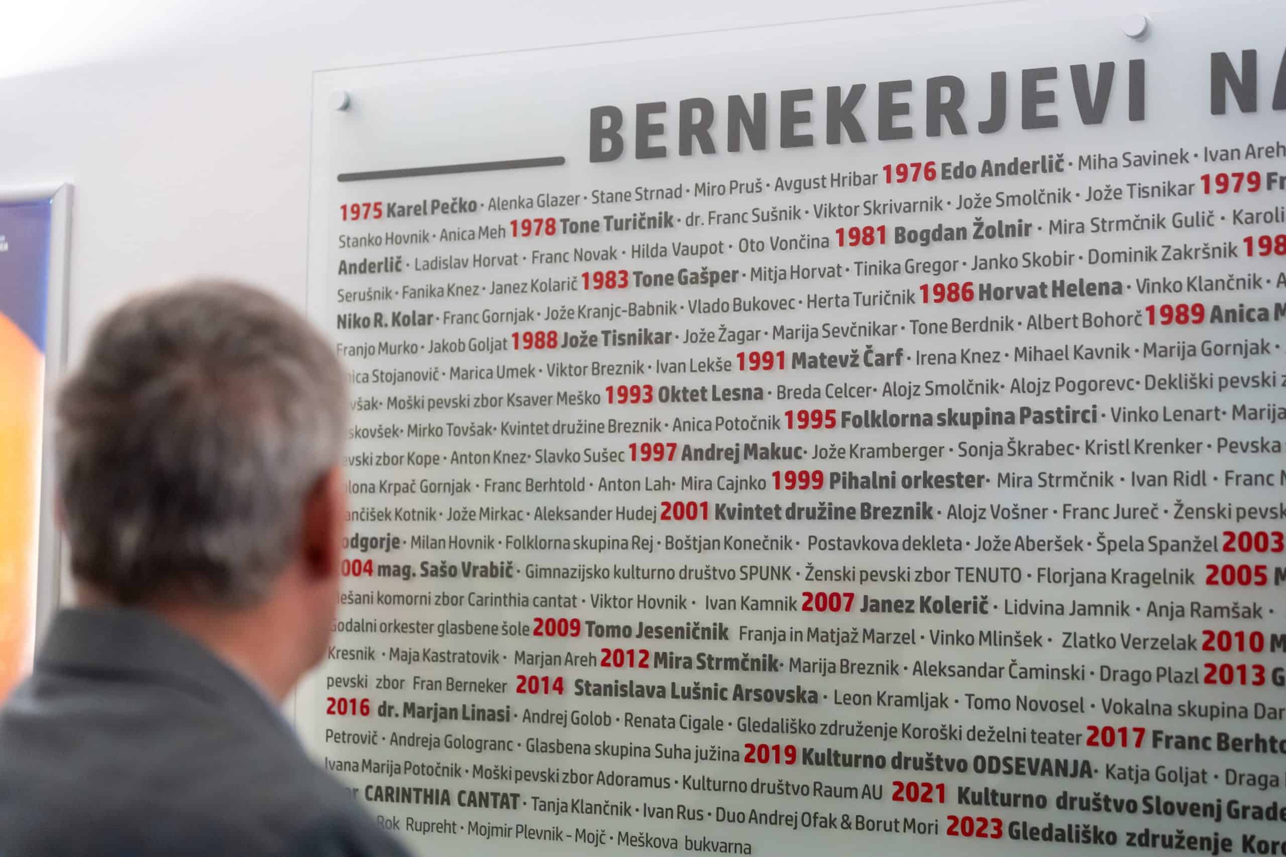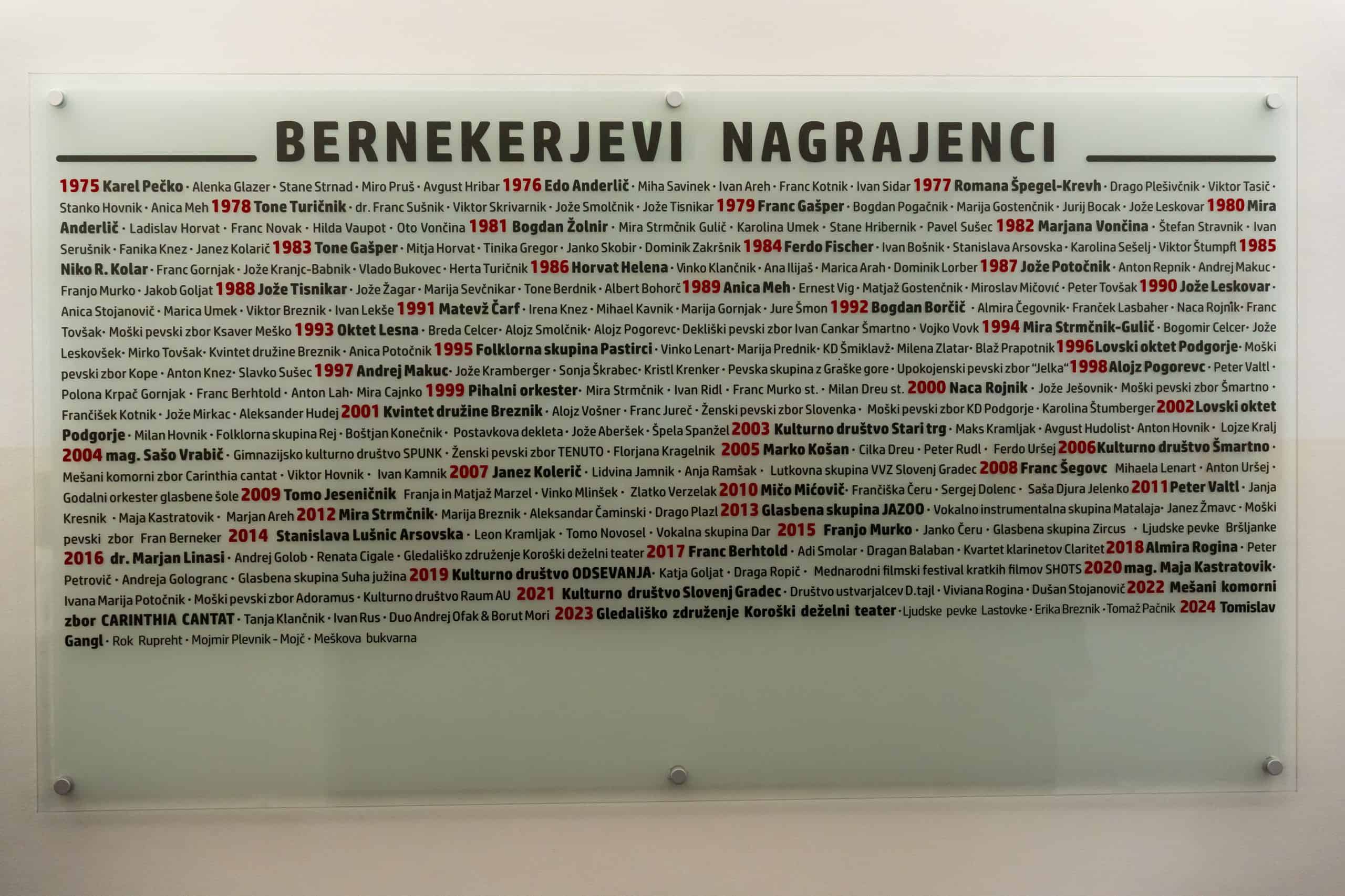 Nocoj, 5. februarja 2024, ob 18. uri so v Kulturnem domu Slovenj Gradec, podelili najvišja priznanja na področju kulture v Mestni občini Slovenj Gradec. Prav v letošnjem letu praznujemo 150. obletnico rojstva Franca Bernekerja, po katerem se omenjena prireditev tudi imenuje.