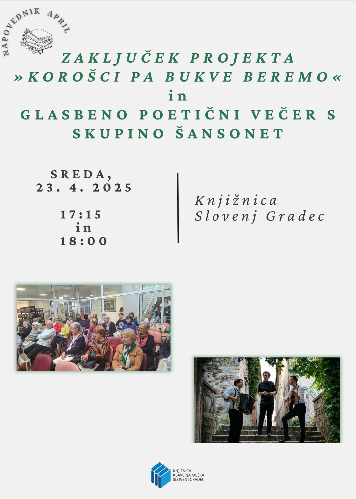 Podelitev bo potekala v sredo, 23. aprila 2025 – na svetovni dan knjige – ob 17.15. Po uradnem delu bo ob 18.00 sledil čaroben glasbeno-poetični večer s skupino Šansonet, ki bo poskrbela za prijetno vzdušje v znamenju besede in melodije.