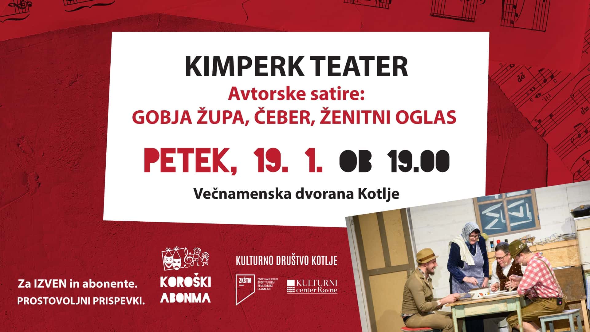 V petek, 19. januarja 2024, ob 19. uri, bo Večnamenska dvorana v Kotljah gostila enkratno predstavo avtorskih satir z naslovom "Gobja Župa", "Čeber" in "Ženitni oglas". V izvedbi Kimperk Teatra, znanega po svojem značilnem pristopu v narečju 'kimperščini', bodo gledalce nasmejali do solz.