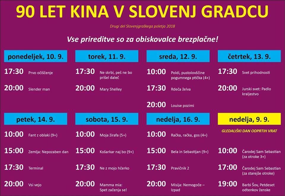 Kino Slovenj Gradec letos obeležuje že 90 let. V tej priložnosti se bo razvrstilo mnogo dogodkov, ki bodo za vse obiskovalce brezplačni. Dogodki bodo potekali od 10.9.2018 do 16.9.2018