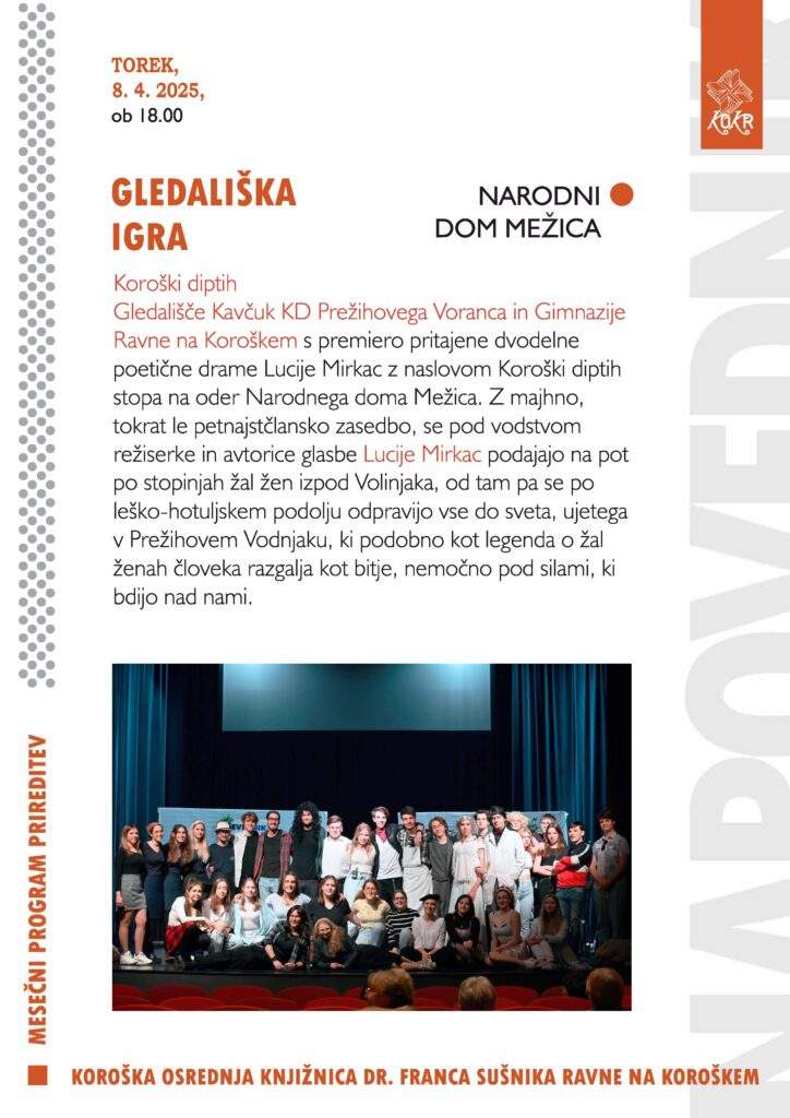 V torek, 8. aprila 2025 aprila ob 18. uri, vas bo s Koroškim diptihom navdušilo Gledališče Kavčuk KD Prežihovega Voranca in Gimnazije Ravne na Koroškem.