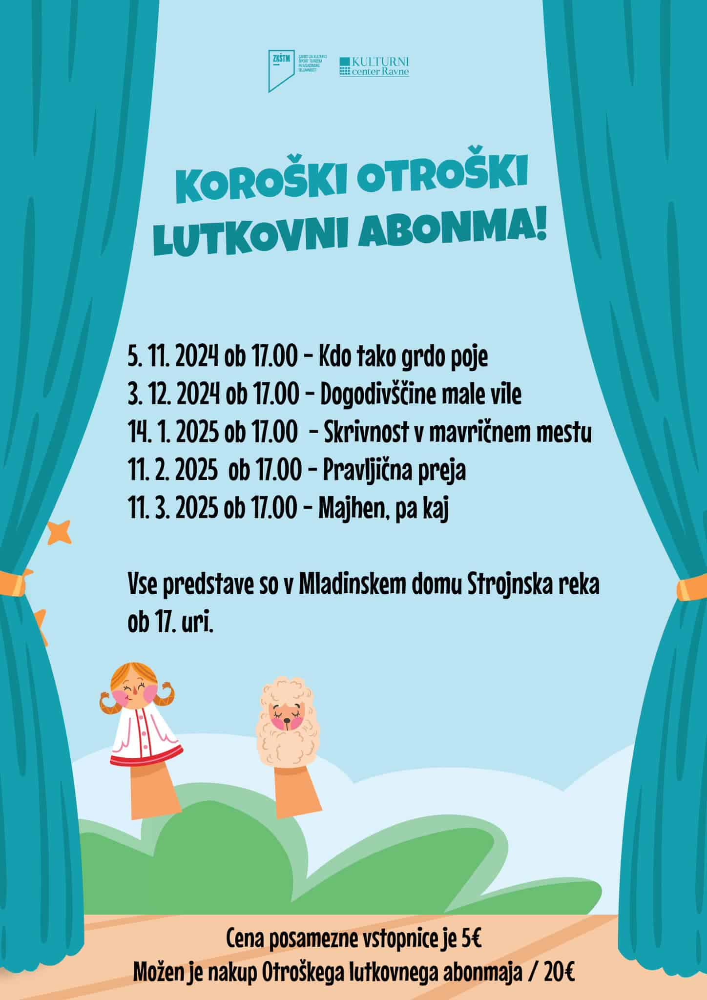 Lutkovne predstave bodo na sporedu vsak mesec, zato si pravočasno zagotovite svoje vstopnice. Na voljo so tako vstopnice za posamezno predstavo, kot tudi vstopnice za celoten abonma. Več informacij o predstavah in nakupu vstopnic boste našli TUKAJ, za vse informacije in vprašanja so vam na volju tudi preko e-pošte andrej@zkstm.si, ali telefonske številke 040 701 588.