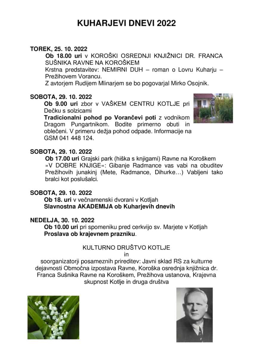 Spomin na brate Kuhar v Kotljah in okolici ohranjajo z različnimi prireditvami, osrednje dogajanje v jesenskem času so Kuharjevi dnevi. Tudi letos, in sicer v soboto ob 9. uri, organizirajo tradicionalni pohod po Vorančevi poti, pohodniki se dobijo pri Dečku s solzicami v središču Kotelj. Isti dan bo v Kotljah ob 18. uri slavnostna akademija, v nedeljo pa tudi proslava ob krajevnem prazniku.