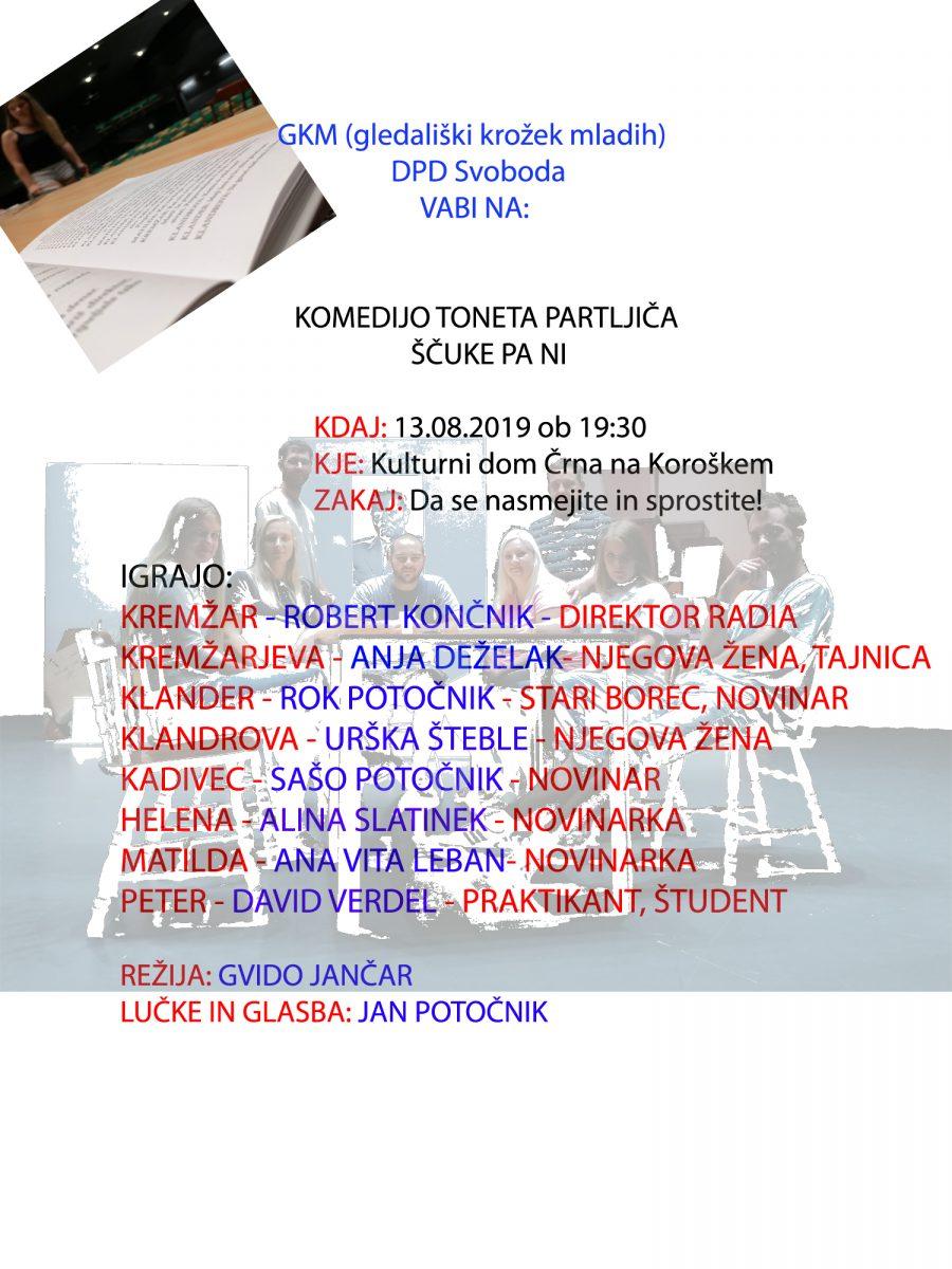 Gledališki krožek mladih (GKM) Delavsko prosvetnega društva (DPD) Svoboda Črna na Koroškem bo v torek, 13. avgusta 2019, ob 19.30. uri v Kulturnem domu v Črni na Koroškem, v okviru 64. Koroškega turističnega tedna postavil na oder tretjo gledališko predstavo v njihovem štiriletnem gledališkem ustvarjanju.