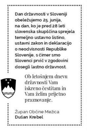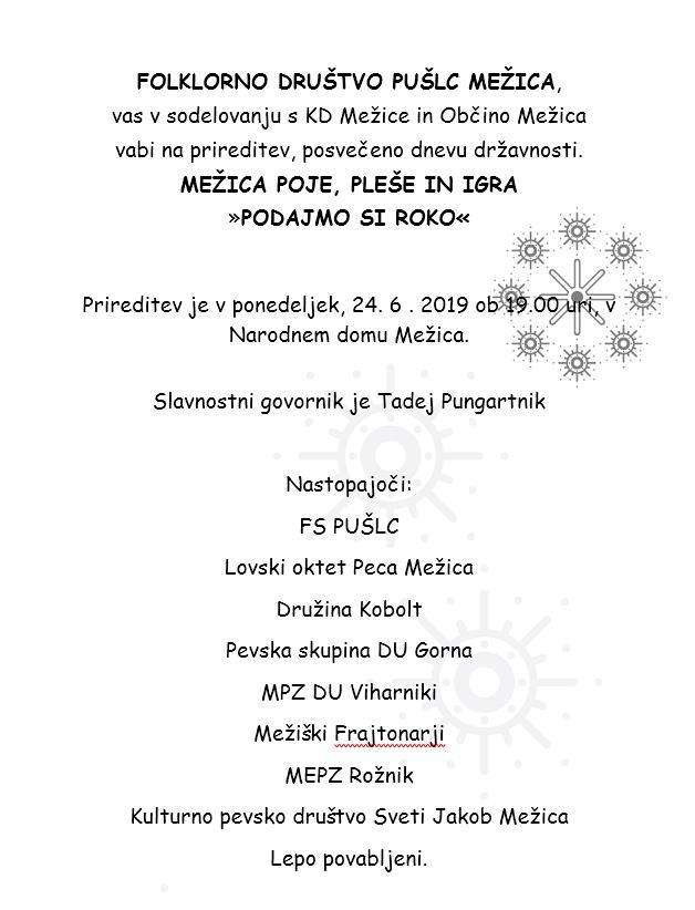 Folklorno društvo Pušlc Mežica vas, v sodelovanju s KD Mežica in Občino Mežica, vabi na prireditev, posvečeno dnevu državnosti, Mežica poje, pleše in igra »Podajmo si roko«, ki bo danes, 24. 6. 2019, ob 19. uri v Narodnem domu Mežica.