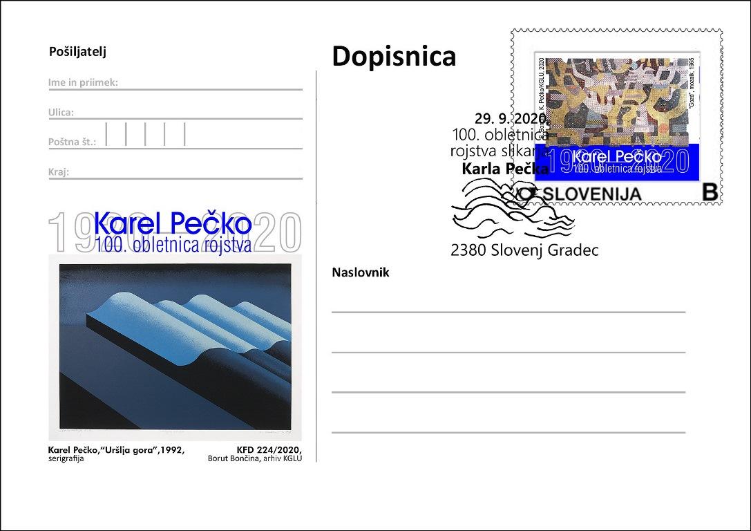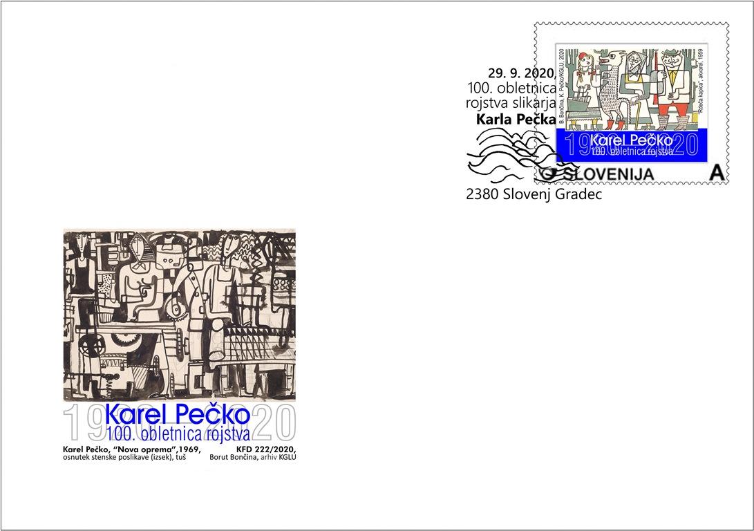 Ilustracija pisemske ovojnice prikazuje izsek iz risbe s tušem (1965), ki je bila izdelana za izvedbo stenske poslikave jedilnice tovarne "Nova oprema" v Slovenj Gradcu in je bila že večkrat prebarvana ter velja za uničeno. Na ilustrirani dopisnici je na pisni strani serigrafija "Uršlja gora" (1992), na risni strani pa je za podlogo uporabljen izsek iz ene od serigrafij "Uršlja Gora" (1981). Na risni strani MK je na fotografiji Saše Reinerja prikazan Karel Pečko ob obnovi stenske slikarije v vhodni veži slovenjgraške bolnice leta 2006.