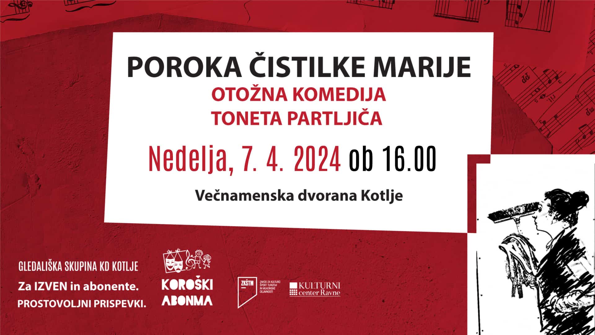 V večnamenski dvorani Kotlje je v petek, 15. marca 2024, premiero doživela otožna komedija Toneta Partljiča: Poroka čistilke Marije, ki so jo uprizorili člani Gledališke skupine Kulturnega društva Kotlje.