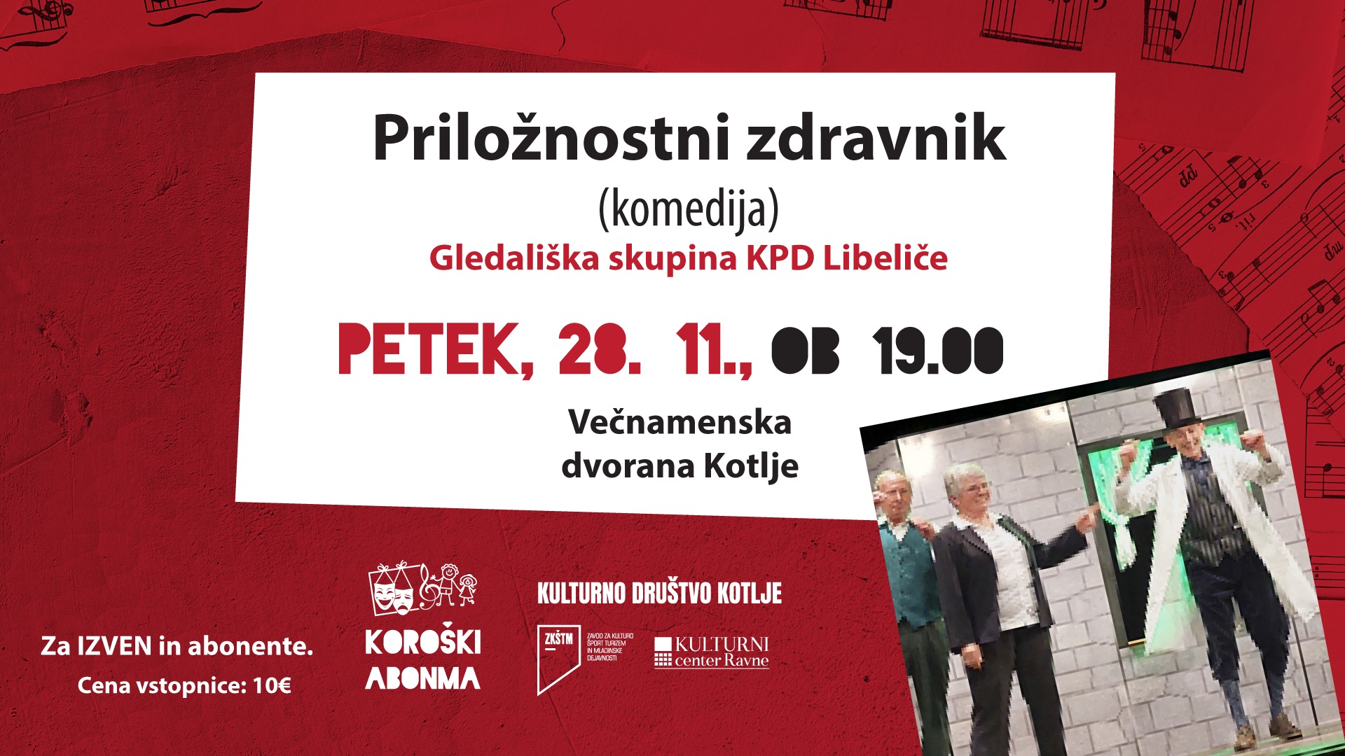 Prva od predstav domačega programa nas bo nasmejala že ta petek, 28. novembra 2025, ob 19. uri, ko bo v Kotljah gostovala Gledališka skupina Libeliče s komedijo Priložnostni zdravnik.
